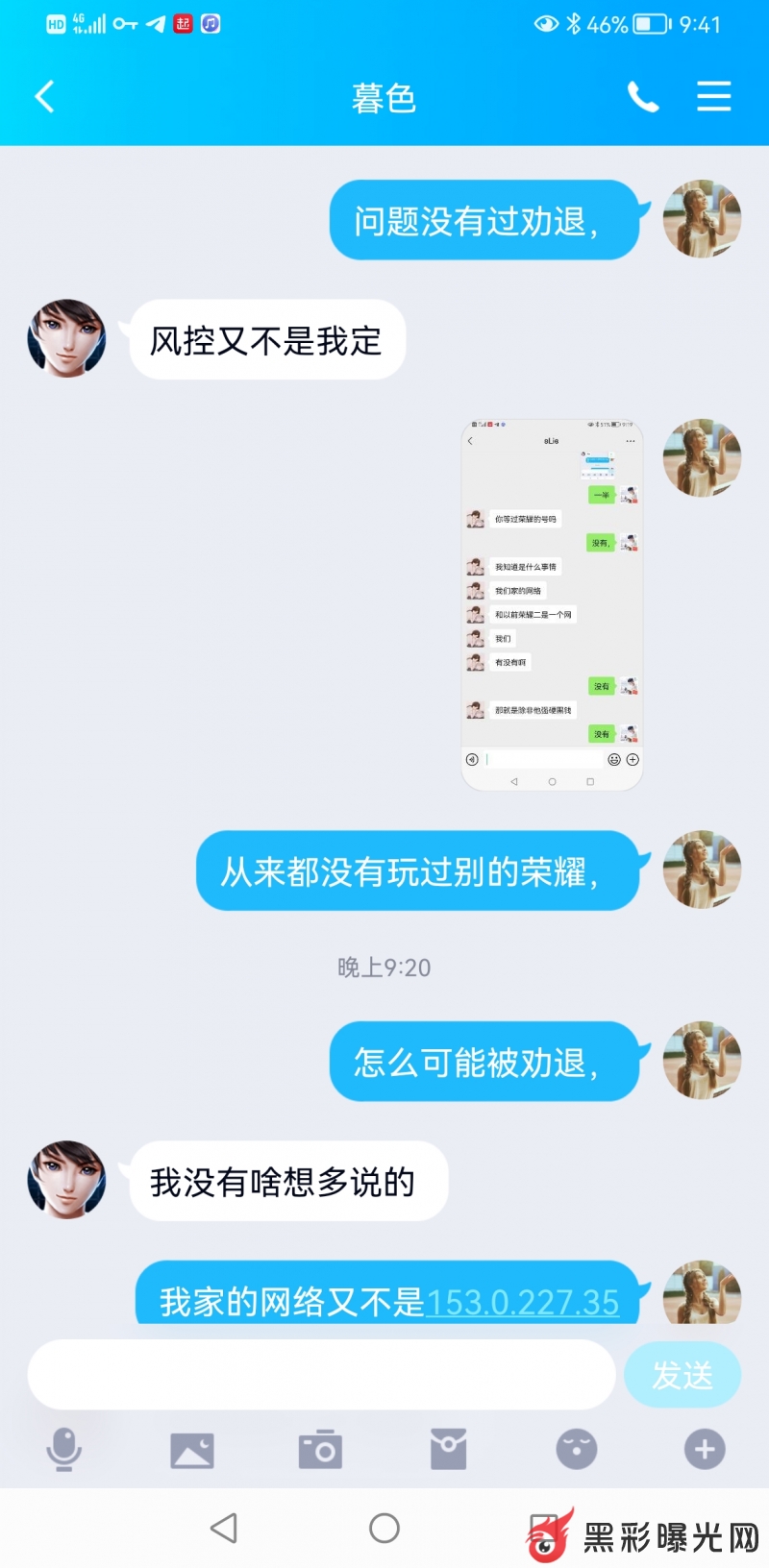 以前在荣耀2暮色下面开过号,最近有朋友找到我说要开户,我就找暮色开了条荣耀3的代理线路,然后会员玩了4天,充值50000左右,盈利了40000来块钱,前面3天取款正常,各种认证,身份证,视频,都认证了,没有别的理由卡款后,就说,同ip劝退玩家,人家自从玩以后都是同一个ip,随便甩出一个ip和账号就说是劝退ip再来,明显硬黑。
