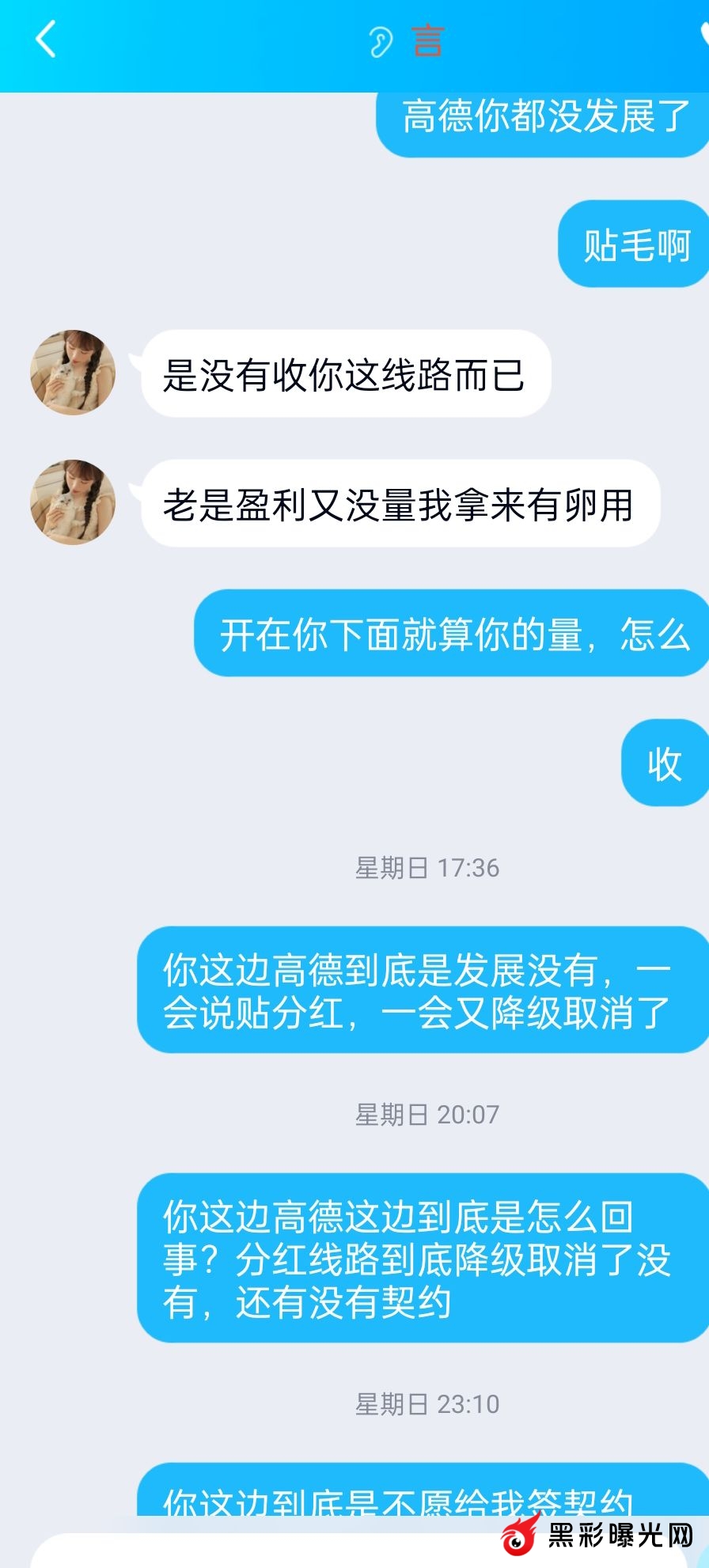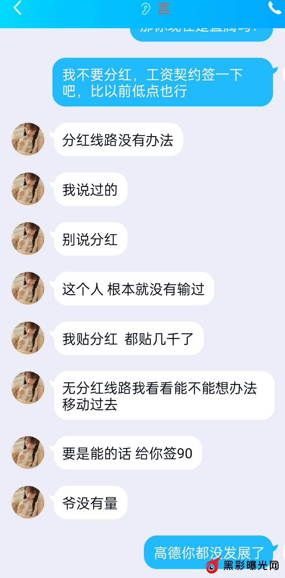 几年前在他下面开户高德,中途还算稳定(分红期说没钱,晚几天发这种事都算小事),过了一段时间,他说他不达标被降级了(这个时候我的契约已经全部取消了),于是我联系下级转移,其中一个下级的所有联系方式一直联系不上(后面知道大概率是进去了),他的下级我更加联系不上了,后面一直未登录高德账号查看,因为想着每个月几千或者几万销量要不要都无所谓,中间一年多未登录了,然后前几个月我登录看了一下报表,有时候每个月十几二十万销量的也有,还不包括分红呢?于是我找到上级能不能给我签个工资契约,分红可以不要,哪怕少一点也行拿一半也行,上级忽悠说他自己也没有契约,一会说他每个月还贴分红(有聊天记录为证)简直牛头不对马嘴,满嘴谎言,那我说 把我这条线转移到其他人旗下,他说平台不允许转,然后我找到高德另一位大佬级人物,这位大佬帮我问了可以转移,不过需要我这位上级的同意,这个狗日的就是不同意我转移到别人旗下,后面问了才知道,我这个上级虽然被降级但是还是有工资跟分红,就是想黑我,至此我实在没办法,虽然有气但还是想着算了,本来做这行要低调。然后前两天心烦登录又看了一下,这个月高德销量几十万,输十几万,越想越不爽,就此举报这个黑代理 飞机 @my383343 QQ383343 此人目前做傲世 跟奇亿(这个狗日的,当初奇亿开业,还叫我还上了人支持了他),当初傲世关闭之前,专线给了我他的联系方式(站内信也说过)说这是我的新上级,关闭之后,这个狗日的就让我去的高德,后面傲世开业我重新回来,这个狗日的契约起码改了老子三遍(傲世后面接手的完全比不上以前的)后面我傲世的人越来越少,去年就剩一个大户,这个狗日的上级说拉低他的分红���把这个大户禁止投注了,因为联系不上这个大户也没了 大家擦亮眼睛,行业末期大部分人都开始黑钱了,不要随便跳槽 黑代理 飞机@my383343 qq383343 此人叫沐言