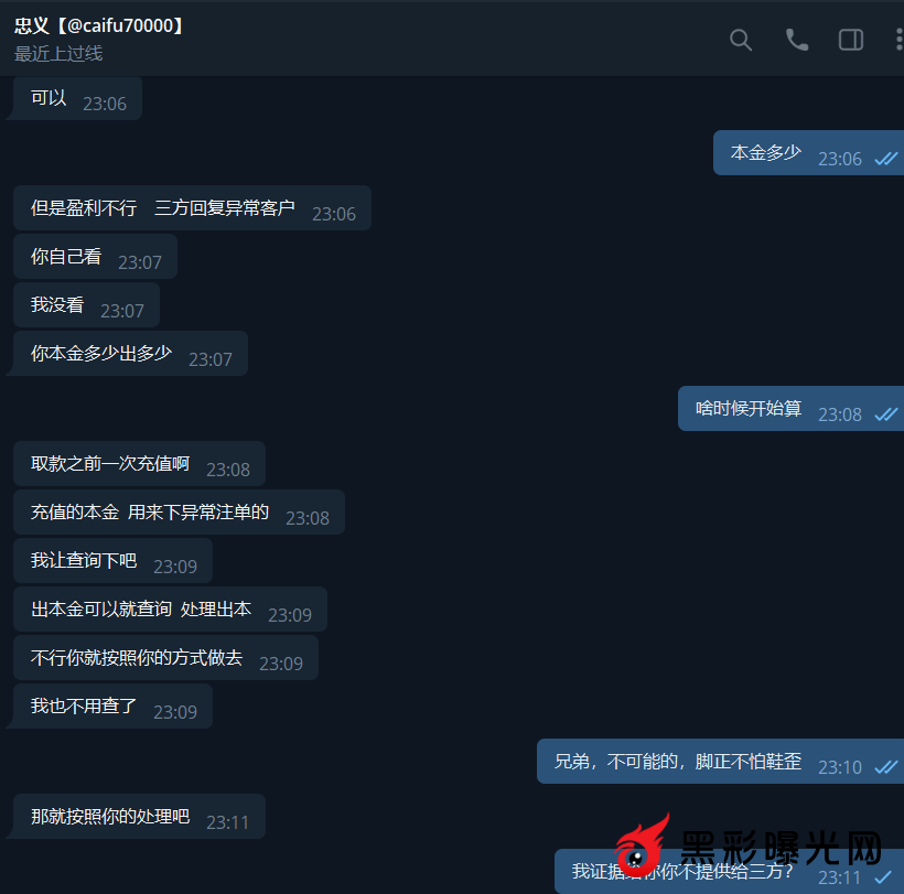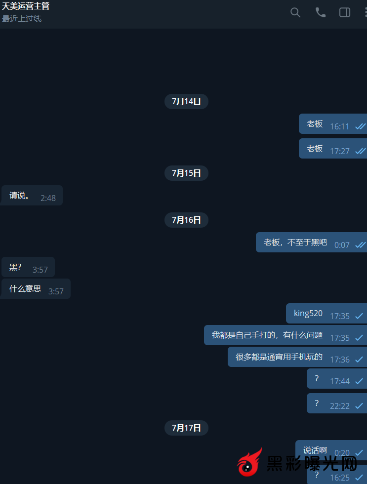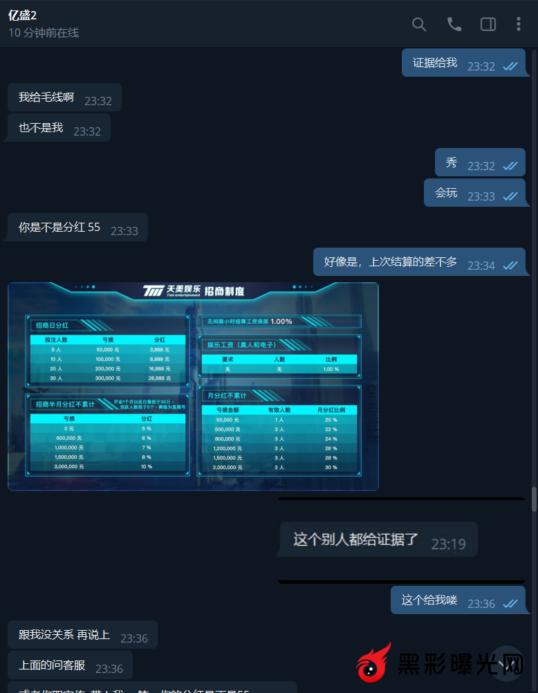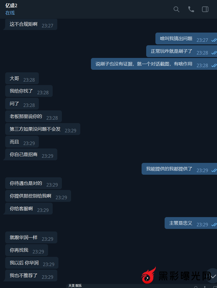 经过:本人玩im和体育盈利5万多,14号去提款,过了一天还没到账联系上级,说三方审核,后面就说三方给出回复说是职业赌徒,劳资赌徒关你们几把事,输钱时咋不说劳资职业赌徒呢,联系上级也不回复,之后回复说我分红55不是他的下级,不给处理,出事后就开始踢皮球,找了几个人几种说法,上级说三方给出的回复说是对刷,天美主管说三方给出的回复是用软件打的,说出本金,凌晨的注单都是手机玩的,平台后台会有提示的,天美这种狗庄既然赔不起就别做狗庄,5万都出不起,真给这个行业丢人,本人在卧龙,宇博,欧皇,威客玩电竞都正常出款了,电竞比赛我是跟着蜂鸟电竞app里面的主播的方案买的,购买记录都有,相关证据在后面,业内同行自有判断能力,当事人飞机@boss168,欢迎大家来对峙