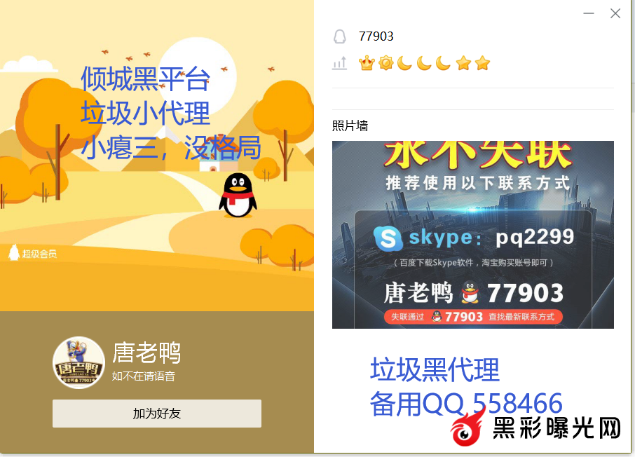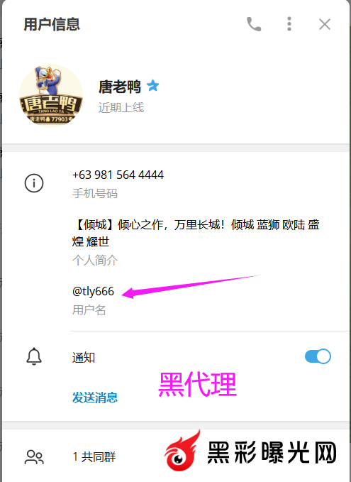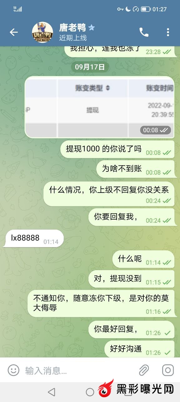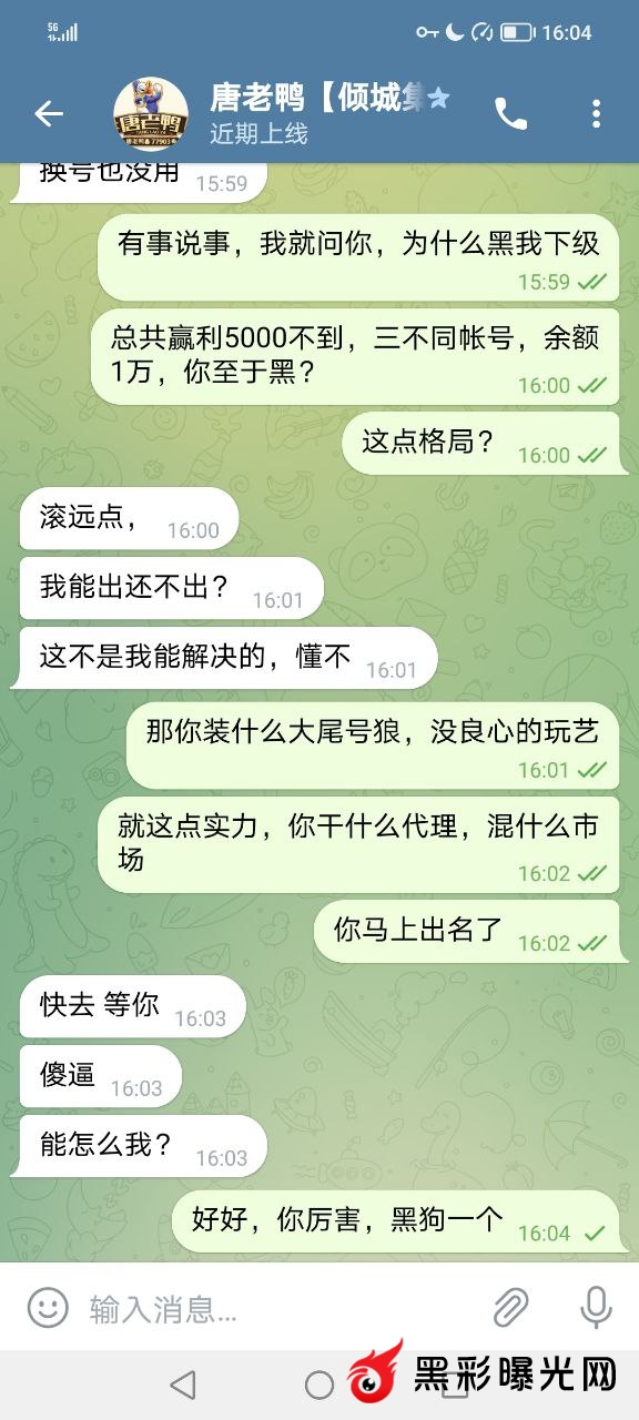 本人之前不熟悉倾城娱乐的,从未用过这个垃圾平台,咨询其他平台的时候,认识了这个骗子代理 ’唐老鸭 ’他小号好几个 QQ77903 飞机号 @tly666 @Ts34222 @QR188 他一直让我上点人支持他下,并且充值送彩金,我上当了,就转了几个下级过来。