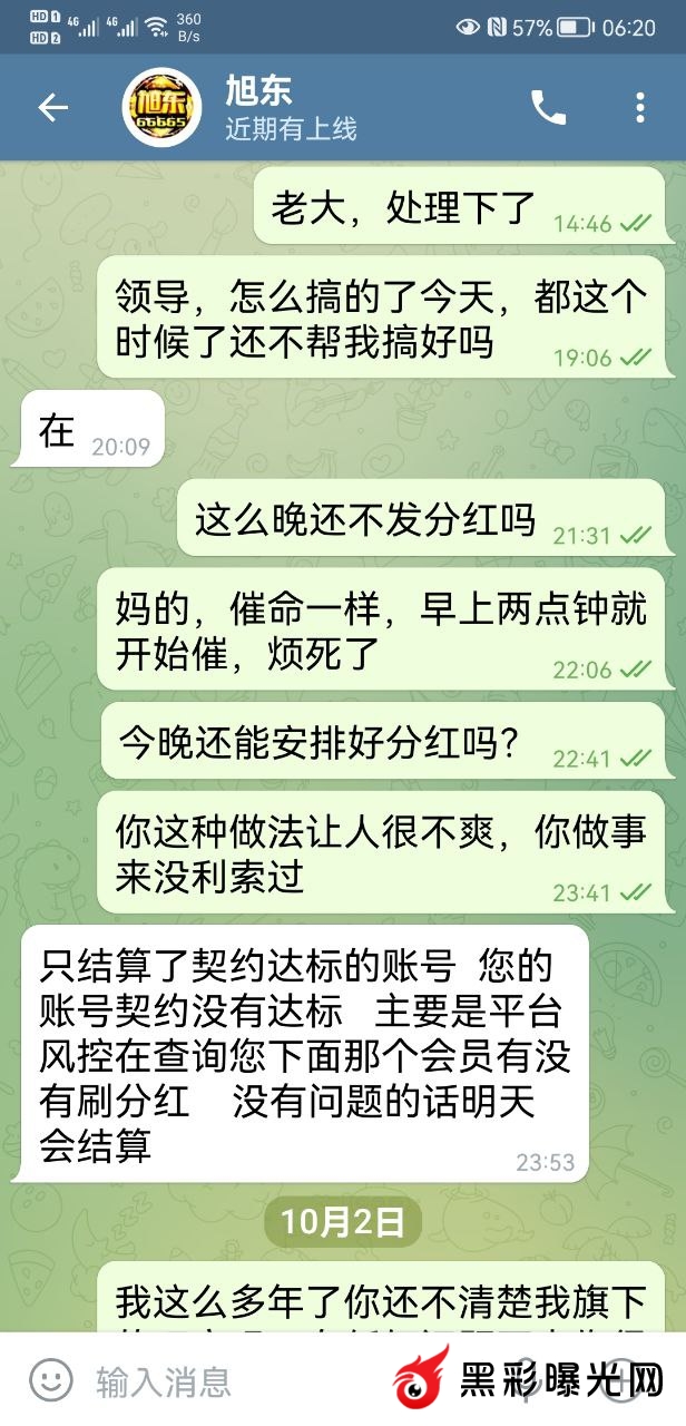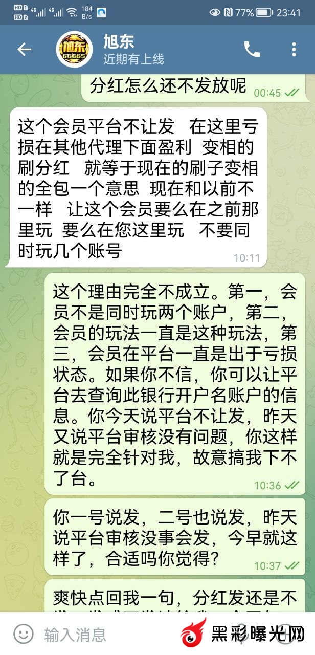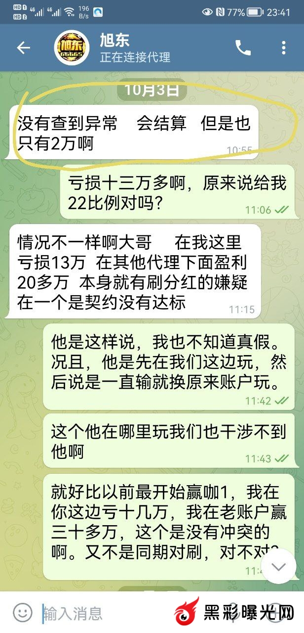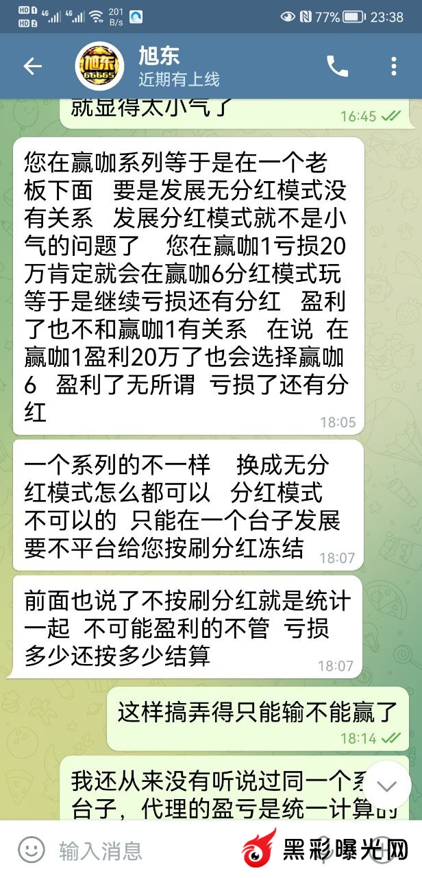 赢咖(开丰)就跟旭东这黑笔做,在赢咖1时候就被他搞过一次,累计分红的那会,有十万亏损没累计,找他他硬说是平台这样统计的,他没办法!发现这个人有问题,因此,赢咖2到赢咖5一直没怎么在他下面发展…到耀世后,就不想跟他做了。期间,经常收到他飞机跟skype发的广告信息,我说他吹牛逼,不实在,他当然否认。聊了阵后他听说我旗下一直亏损,许我以高待遇,毕竟之前有过几年合作基础,就再信他一次,结果会员在耀世也倒霉,几天就亏了十几个进去。凑巧的是那几天刚好有团队在开丰(赢咖1)赢了几万。结果到28号左右这样旭东这黑笔就说了,分红要跟开丰对冲,我去他大爷的这不扯鸡吧蛋吗?分红日那天一直没发分红,期间有问过两次也没回信息,晚上终于回了,说我有效人数不达标,所以才不发,怀疑我会员刷分红,要等平台审核。第二天回复,说审核没有问题,会结算分红,到一直不发,我也没问。第三天问,就直接说不发了,然后回复我的审核没有异常,会结算分红这句话也被他从飞机删除了。之前他说要跟开丰对冲,就预料到他要搞事,因此有截图聊天数据。