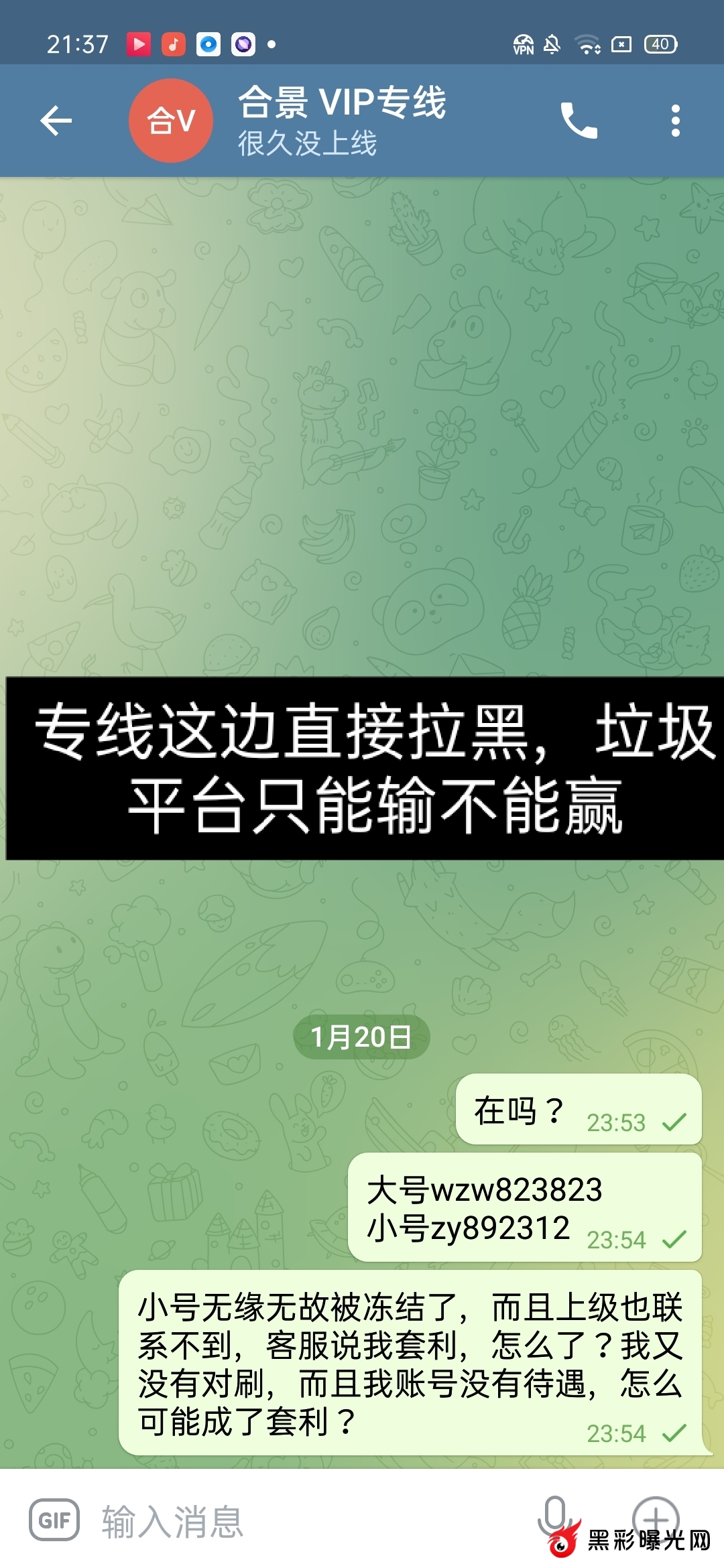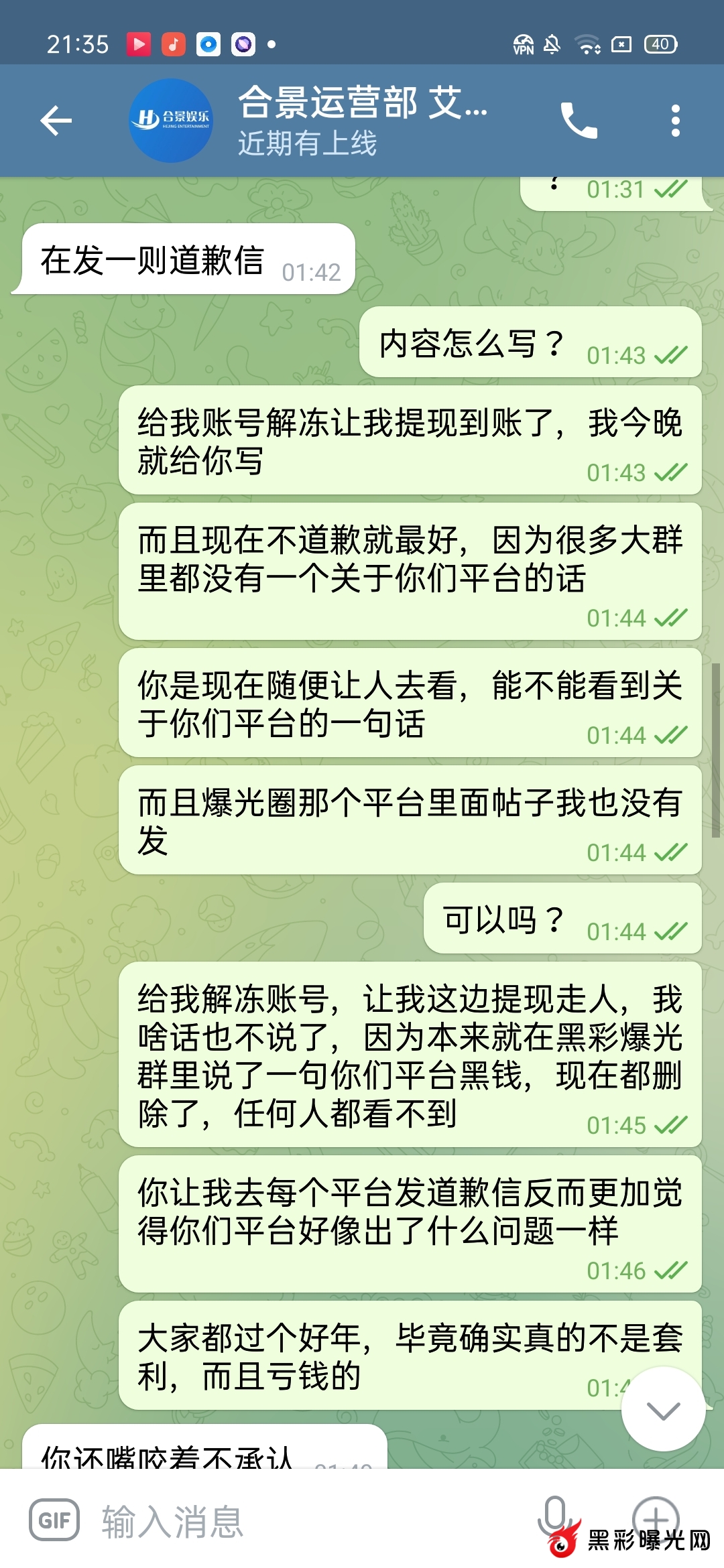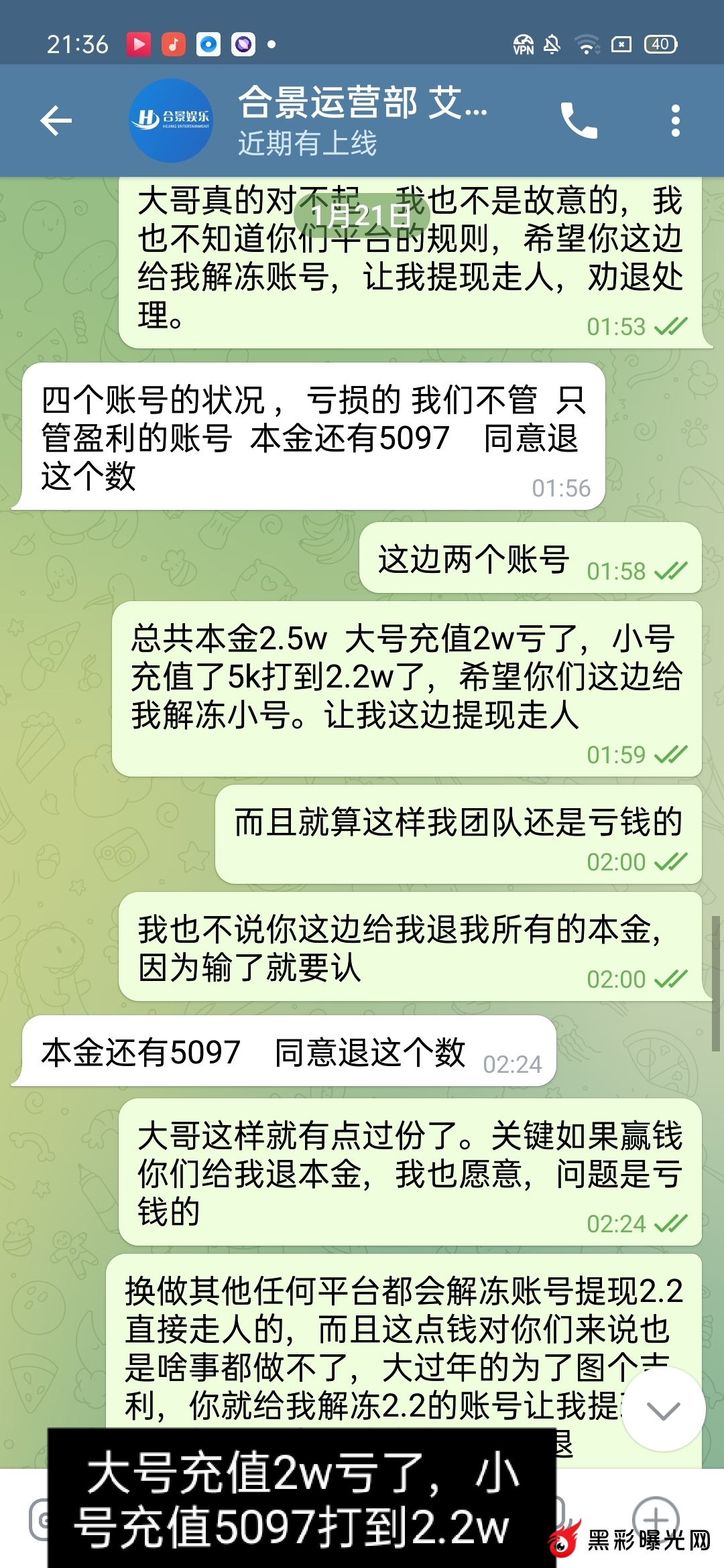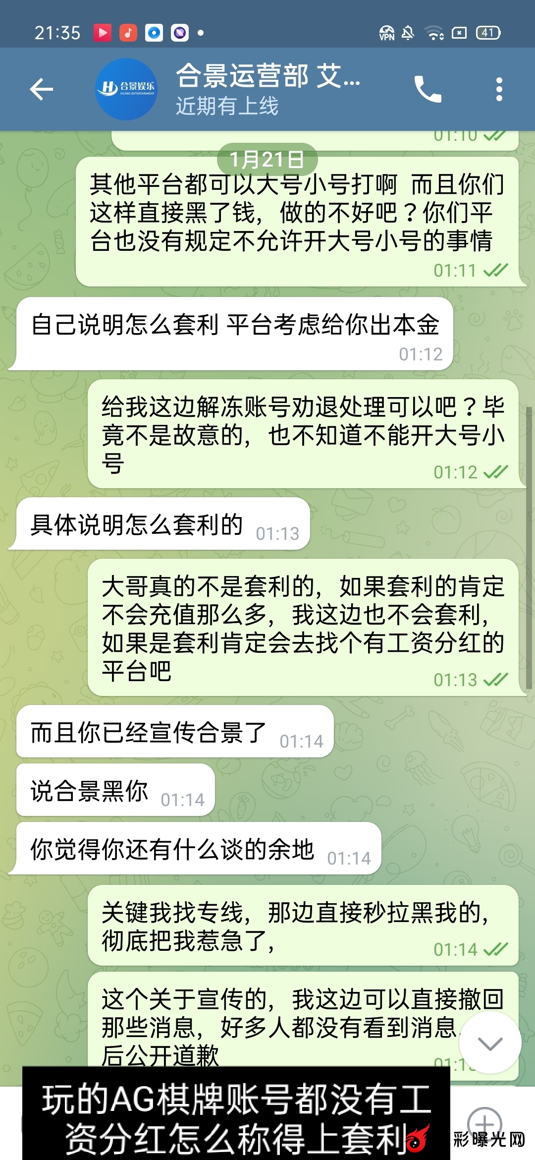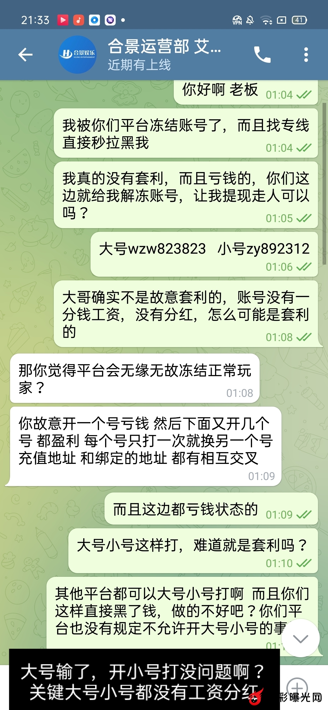 我通过合集网注册了合景娱乐平台,然后上去玩大号wzw823823充值2w玩输了,我自己换个小号zy823912换个运气,小号充值了5097元然后又继续玩,玩的时候没有冻结一切正常,然后盈利了提现了1203元也到账了,继续打到2.2w的时候账号突然冻结,我去找客服,客服那边说团队同IP棋牌套利,永久冻结了让我找上级,合集网注册的上级找不到,我去找专线专线直接拉黑没有说一句话,然后黑彩曝光网就发了一句合景娱乐黑钱,有人给我介绍了运营的联系方式,我去找了运营,运营说让我说明我是如何套利的,关键我这边大号小号没有工资没有分红,两个账号大号小号都没有投注一分钱的彩票,都是玩的AG和棋牌。请问我如何套利?让我承认我套利?明明没有套利凭什么要承认。让我去把宣传的消息删除我也删除了,只希望给我提现走人,让我提现小号的2.2w 作为劝退处理,可是我消息删除了。然后让平台给我提现2.2w,可是运营说亏损的大号平台不管,只退小号的本金5097元,我想问为什么?就算给我提现2.2w分我也是亏损状态。平台也不亏钱。平台大号充值2w亏得时候中间怎么不说个套利不冻结账号呢?我注册小号充值5097元去玩的时候怎么又不冻结?可是偏偏我盈利了,提现的时候为什么说是套利?请问我套什么利?彩票一分钱都没有投注,大号小号都是玩的百家乐(AG)和棋牌,注意:大号小号都没有工资和分红. 刚开始找的专线,专线直接一句话都不回复,直接拉黑我的,然后找运营(飞机号:@hejingyule)运营的意思是让我删除宣传消息,而且亏损的大号他们不管本金2w也不退,只给我退你小号的本金5得097元(只能输不能赢),而且让我承认是刷子,而且让我说明如何刷的 ,我刷你妈逼,老子大号小号都没有工资和分红,我刷你麻痹。我这边大号充值了2w,小号充值了5097元,小号打到了2.2w。输的2w我也认了,关键小号本金5097打到了2.2w,中间提现了1203元。我总体是亏损状态的,让平台解冻账号让我提现2.2w走人,我也是亏钱的 ,平台从我头上赚钱的。怎么平台主管不说给我退本金大号2w+小号5097元呢?这里只能说垃圾平台,只能输不能赢的黑钱平台,盈利就说套利。请问你们格局在哪儿?本人飞机号码:@wzw823823 需要任何证据都可以提供 ,只希望大家远离黑钱平台合景娱乐。以下是专线和运营聊天证据,已经给平台运营三天时间了,运营这边三天在线不理人了.感谢站主提供这个宣传平台,让大家减少损失.
