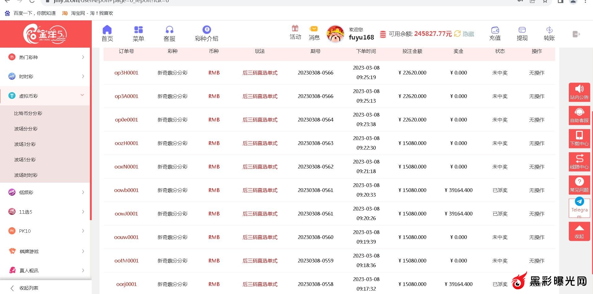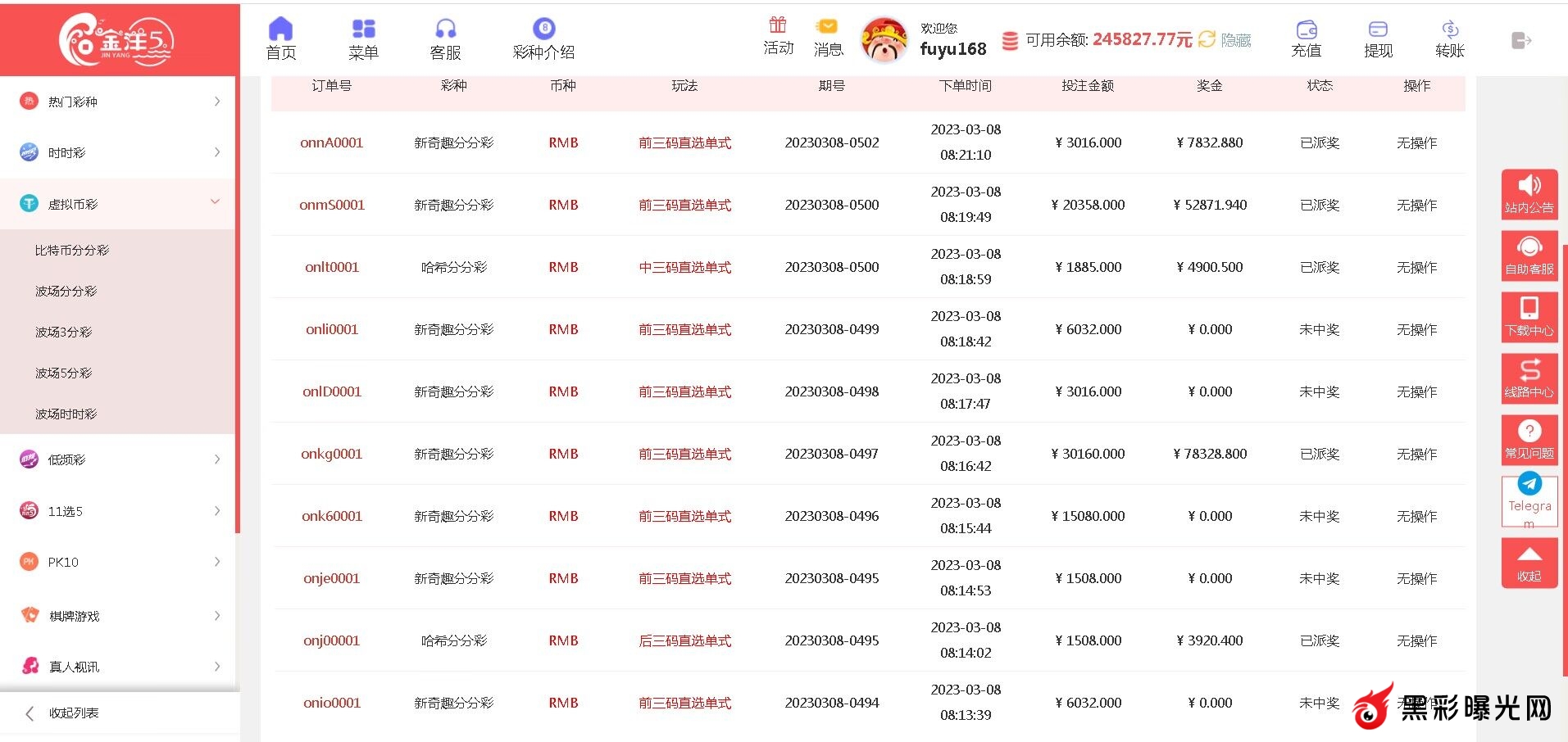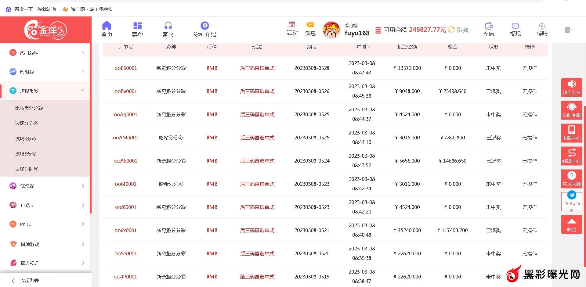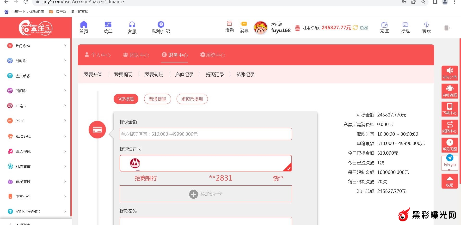 本人3.7日在金洋5上级路远处开户账户fuyu168。充值3.5万本金 固定玩法做号思路 哈希和奇趣 中间曲曲折折打到24.5万 最后两把不中直接输完的,后面六万一把 第一次提款要银行卡 本人银行卡 提款两个小时不处理 。
