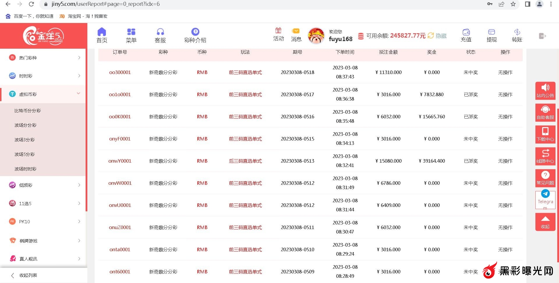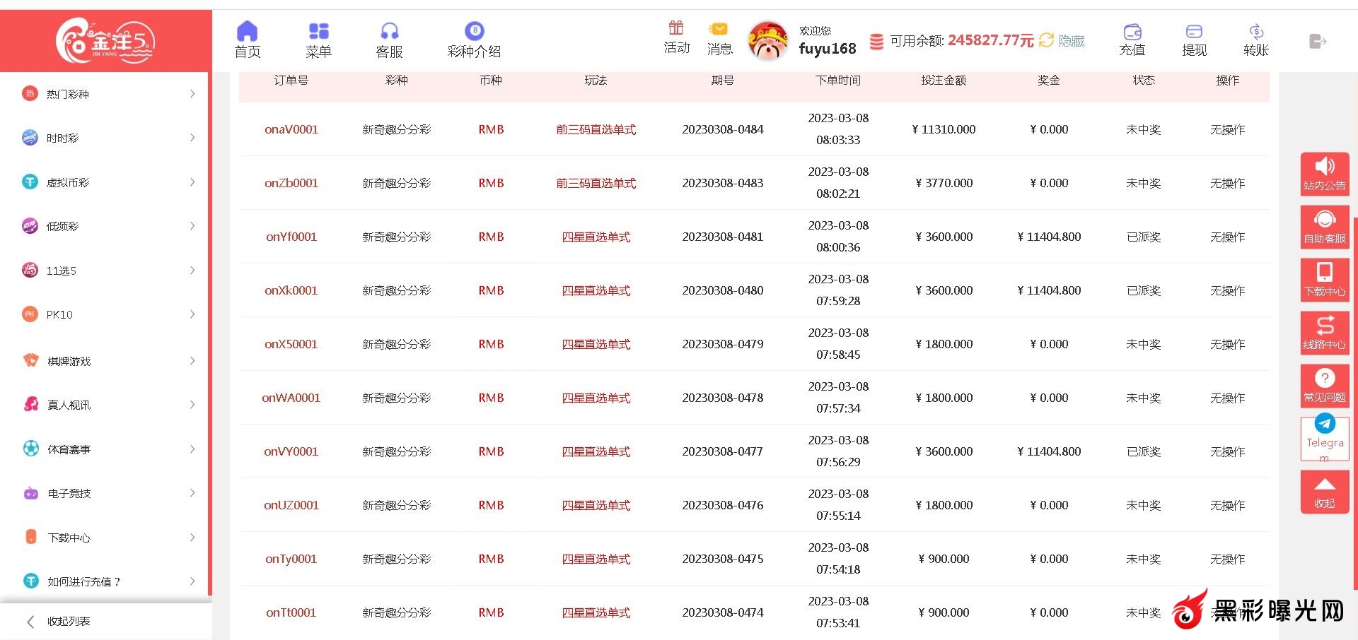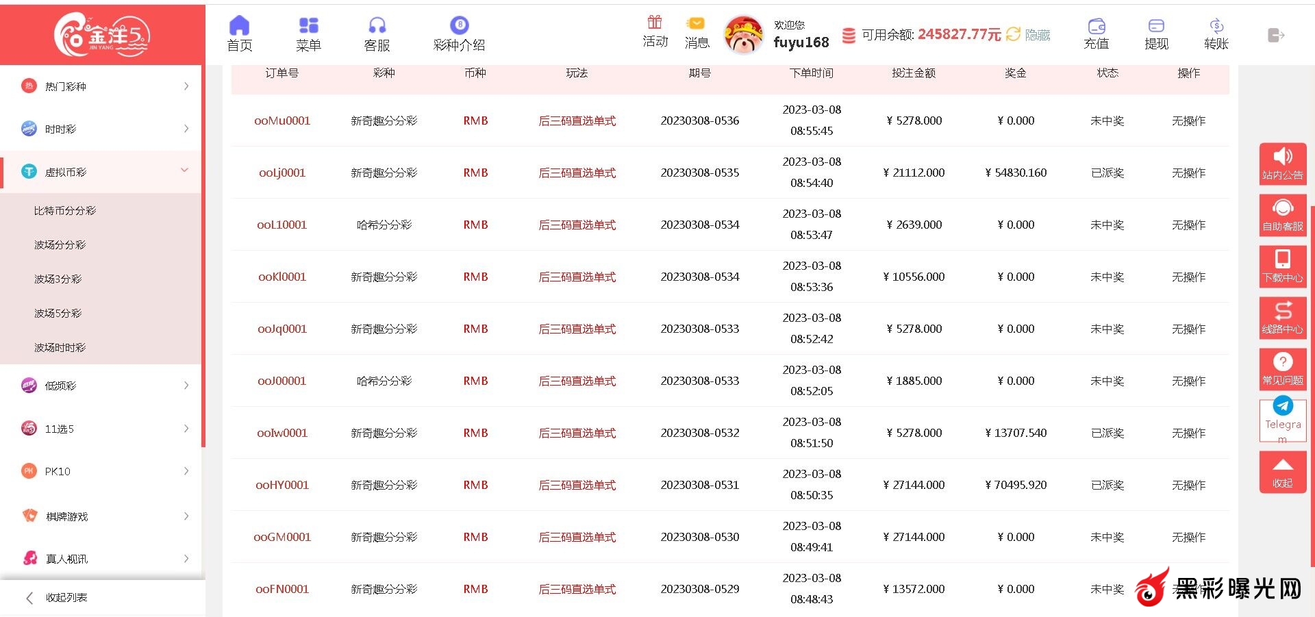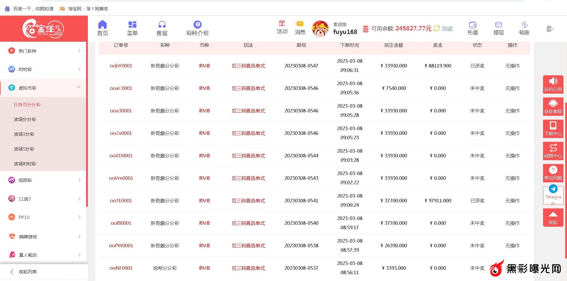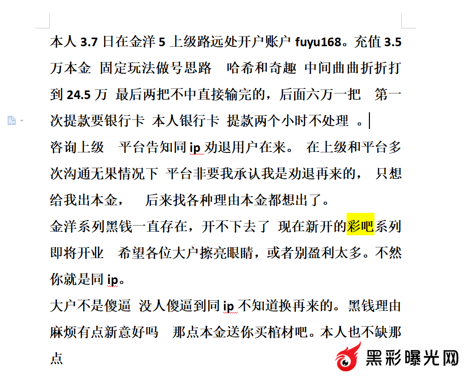 本人3.7日在金洋5上级路远处开户账户fuyu168。充值3.5万本金 固定玩法做号思路 哈希和奇趣 中间曲曲折折打到24.5万 最后两把不中直接输完的,后面六万一把 第一次提款要银行卡 本人银行卡 提款两个小时不处理 。