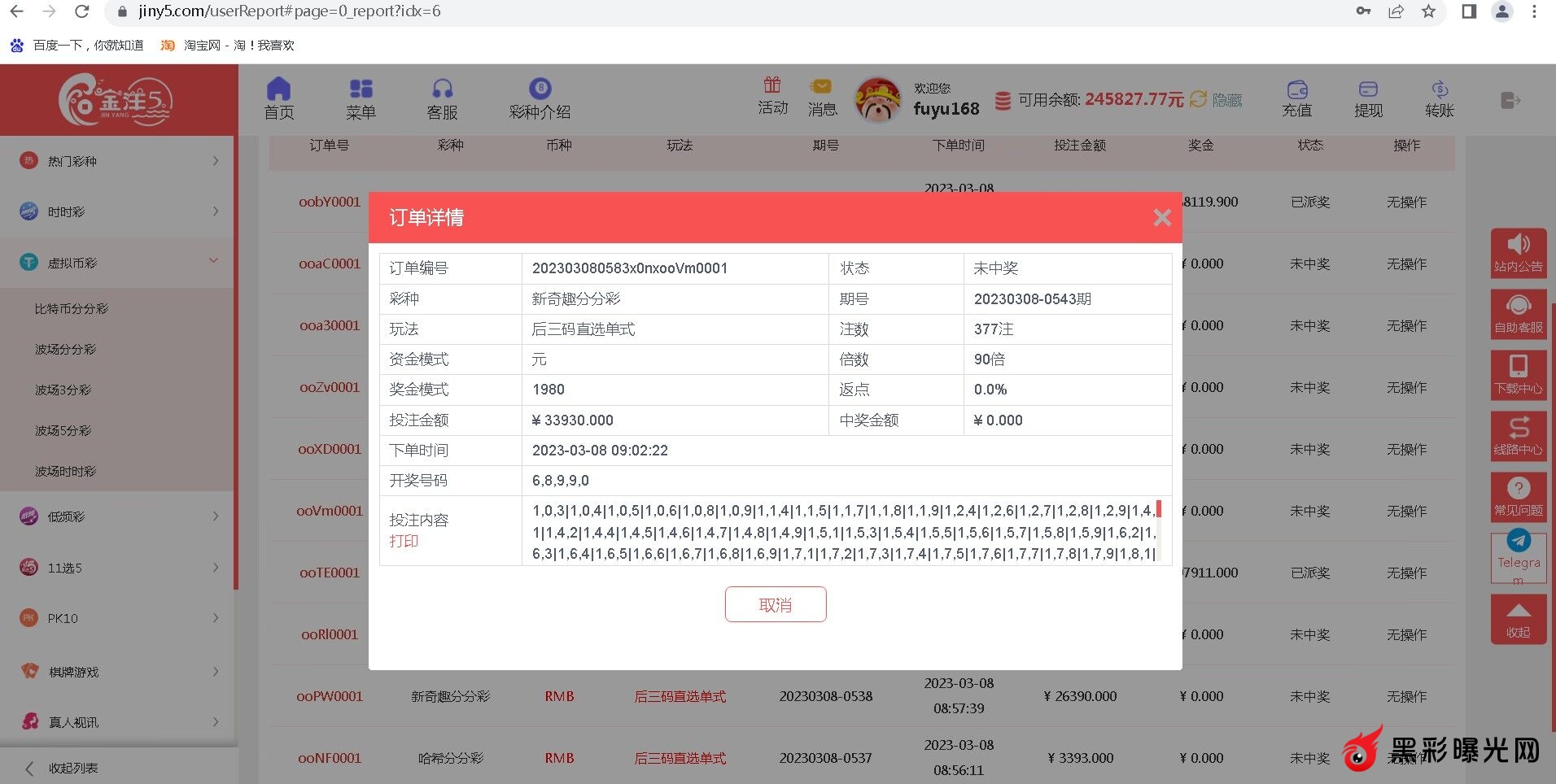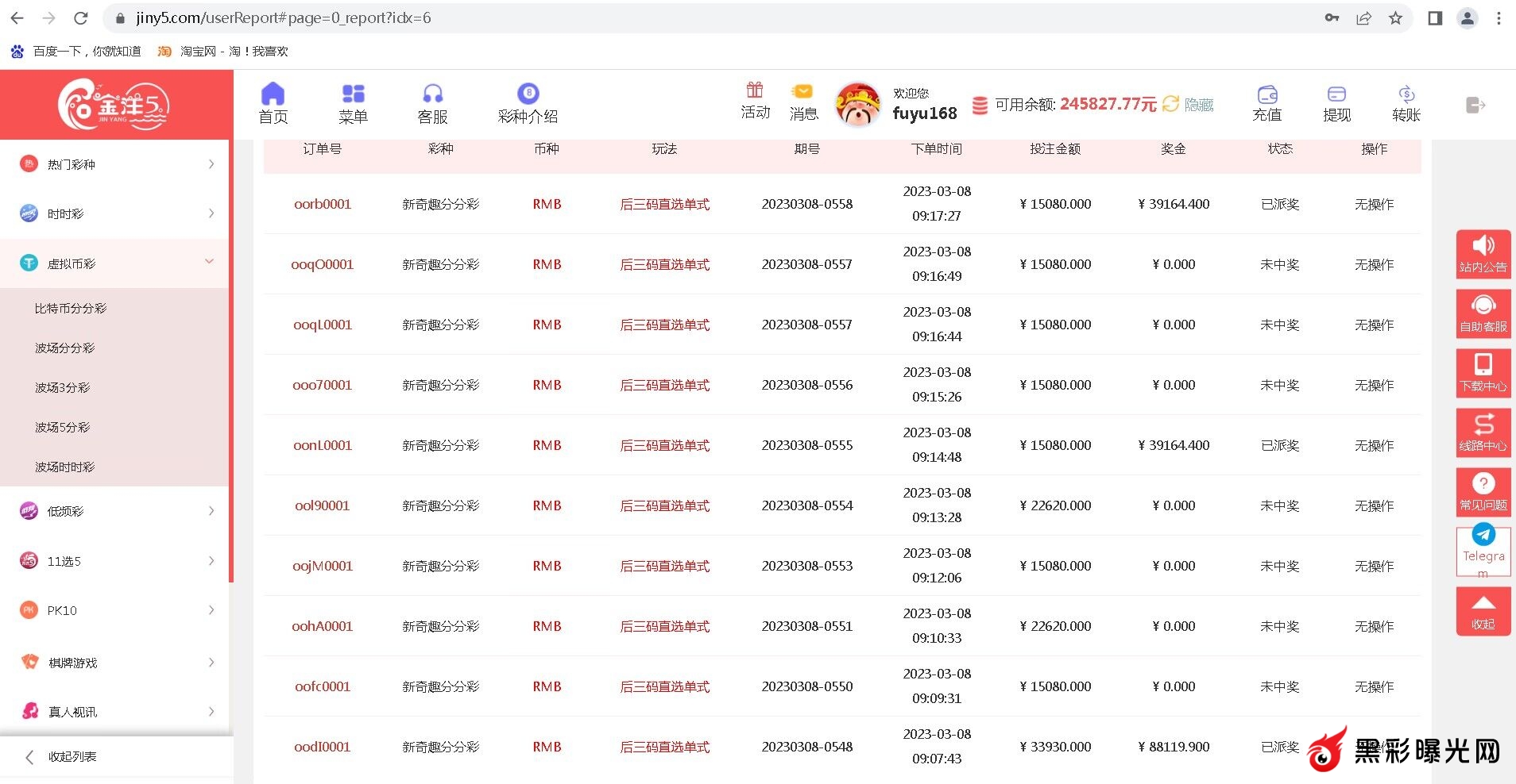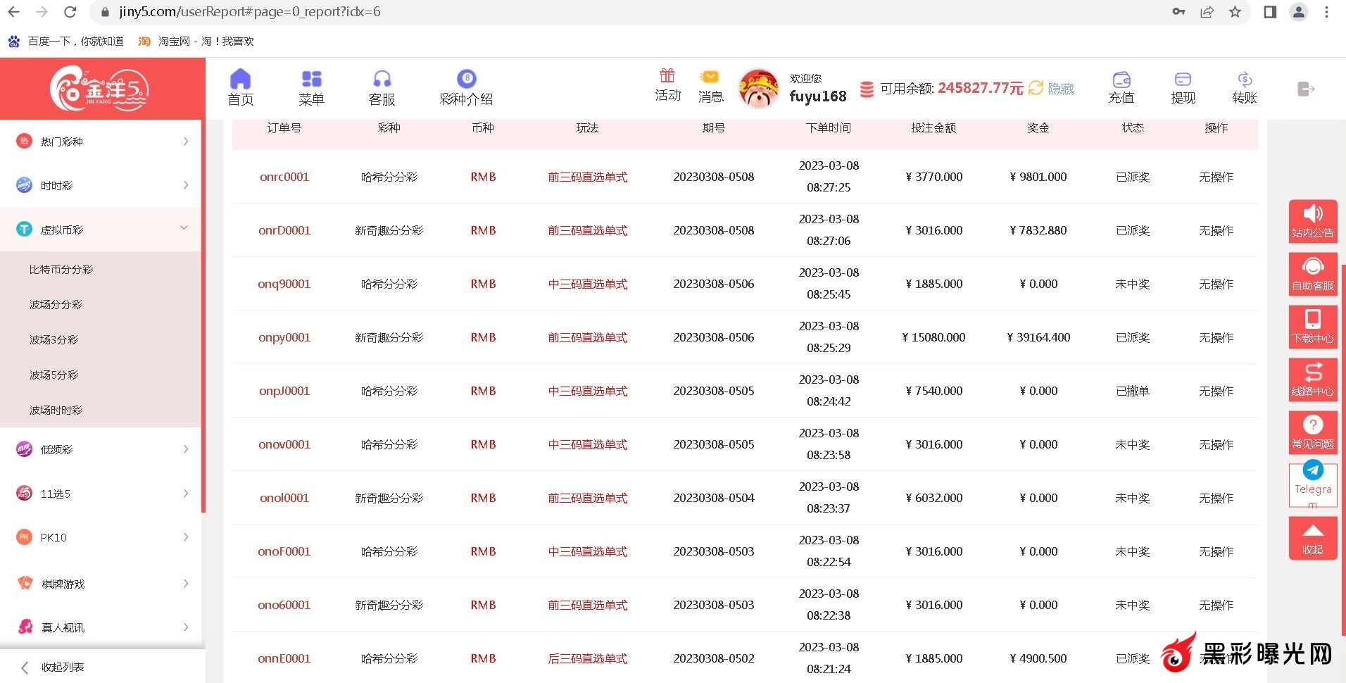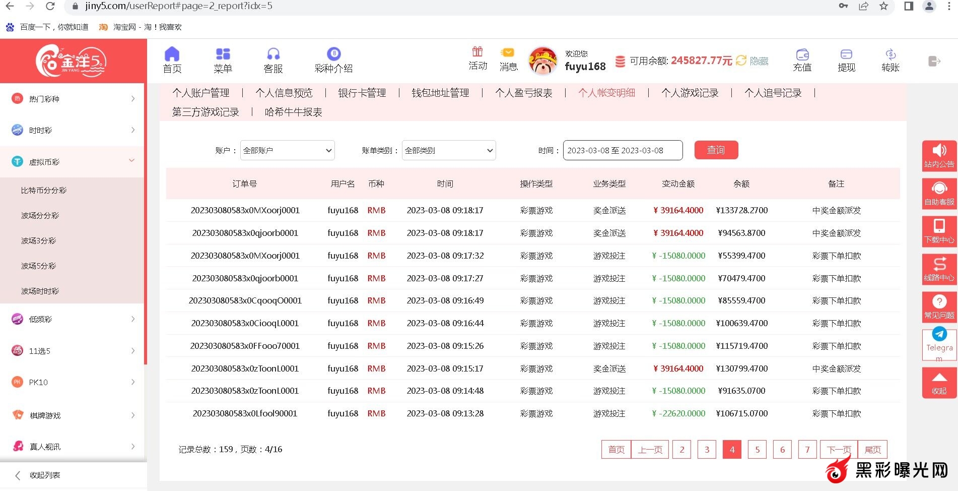 本人3.7日在金洋5上级路远处开户账户fuyu168。充值3.5万本金 固定玩法做号思路 哈希和奇趣 中间曲曲折折打到24.5万 最后两把不中直接输完的,后面六万一把 第一次提款要银行卡 本人银行卡 提款两个小时不处理 。
