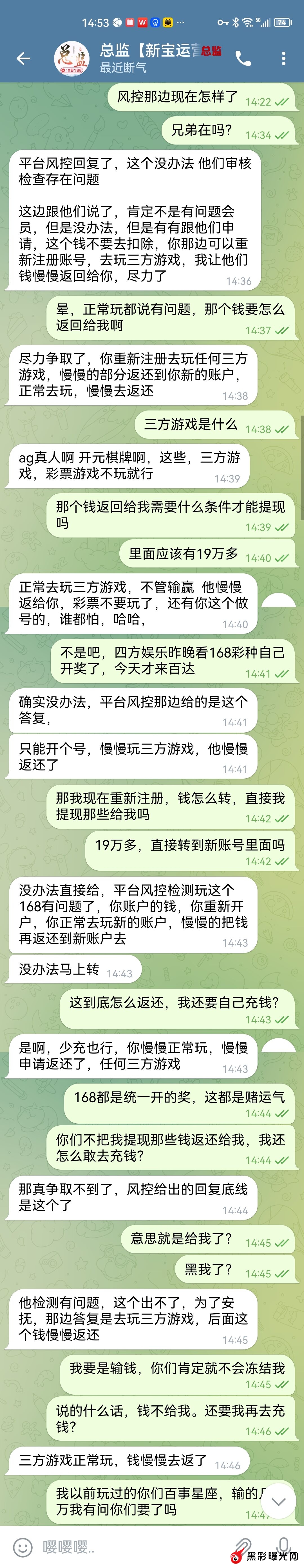 我联系了我上级,他说是风控部门不给处理,也没说是因为什么问题,然后我上级就说平台给我另外一个处理方案,叫我重新注册新账号,然后自己再充钱只能玩他们的三方游戏(开元棋牌,AG真人等),也没说20万怎么还我。这平台讲的是人话吗?黑钱了,还要我再自己充钱去玩他们平台??把我当傻子是吧?