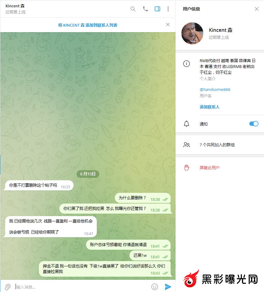 大家一起抵制 黑平台 恒行娱乐,本来这事已经个人理赔给下级1w元 可是恒行的这个黑B负责人 阿森 又他妈出来恶心人。 账户在亏损16w的前提下 就冻结我全线账户 账户押金不退就算了 还恶意的黑掉我下级 yui963 账户余额1w元。这种黑B 纯粹不要一点B脸 ,一起抵制黑平台 恒行娱乐 希望大家引以为戒 !