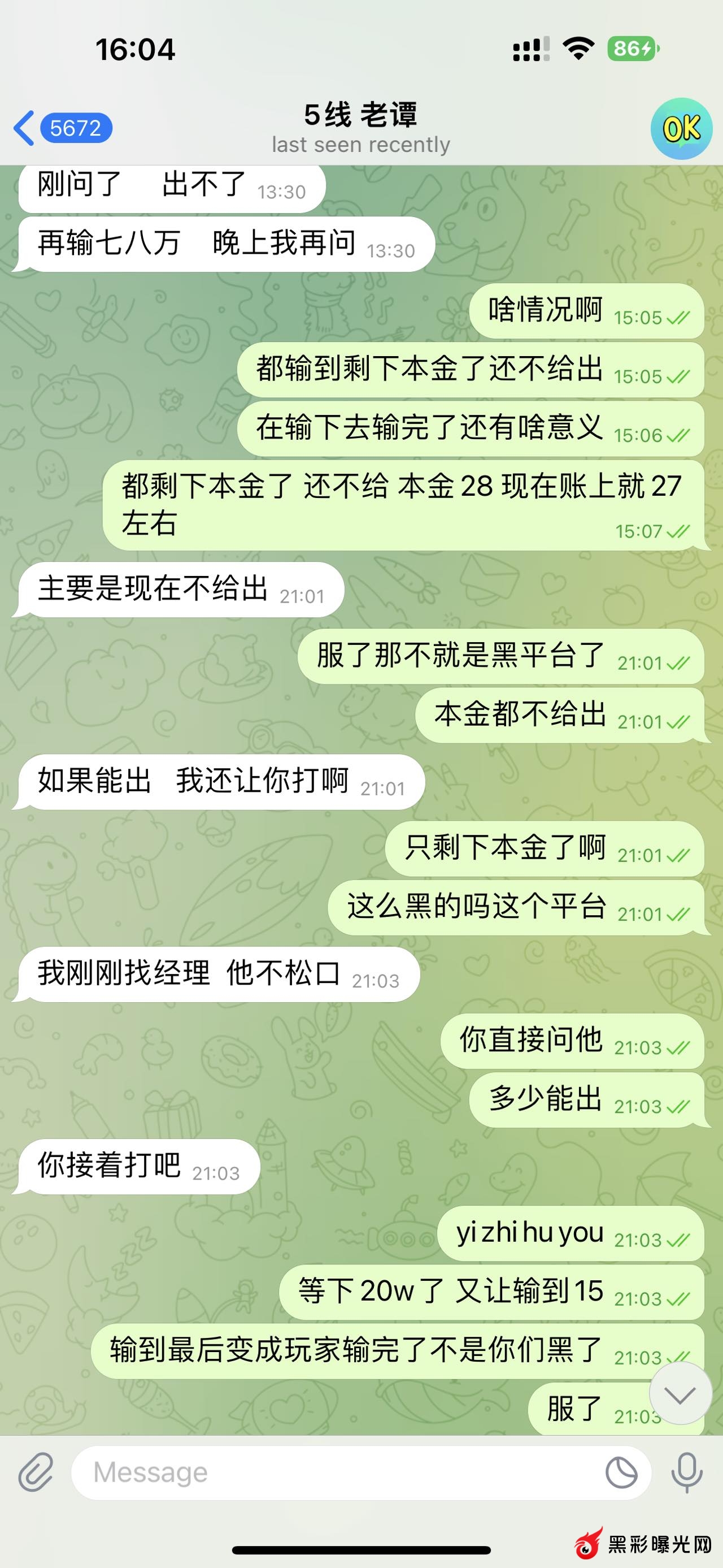 联系上代理后代理引导我把盈利部分输掉 剩下本金给我提款。过了没多久后输到本金了 ,给我的答复是还不够继续输。持续输到账上剩下10w后,还是没有给我出款。还要我继续把钱全部输完。中途拿到过代理反的9w块钱佣金
