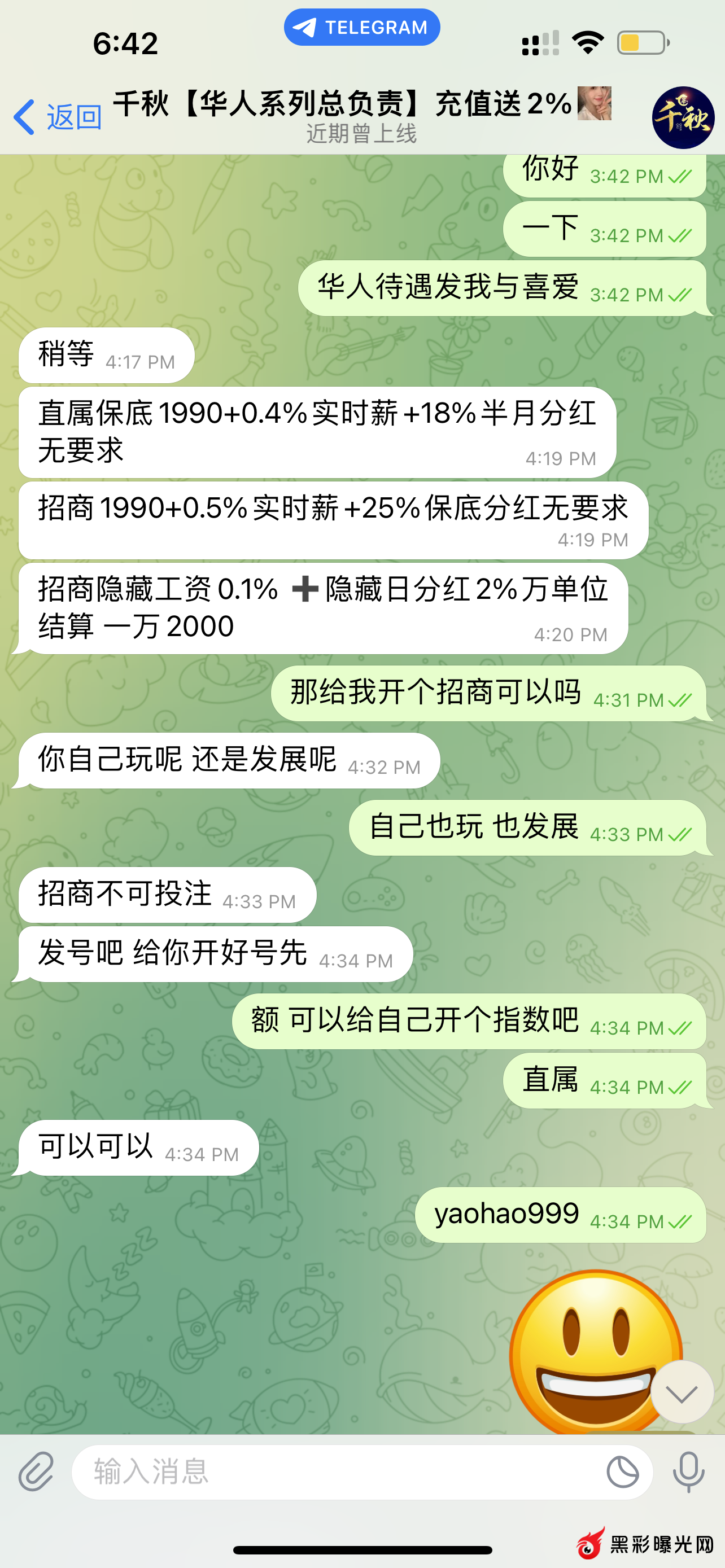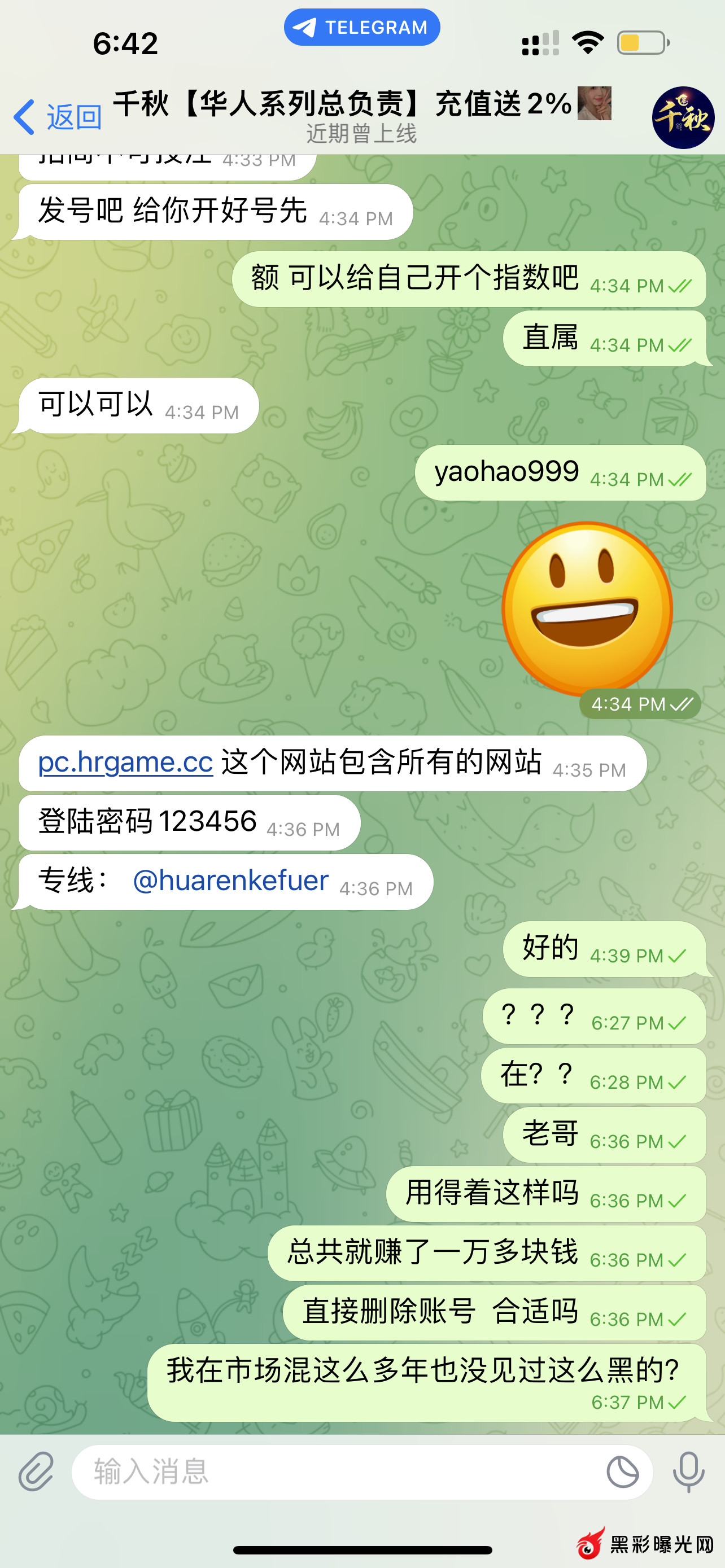 今天找千秋开了个华人2的账户 开了个直属去投注 , 充值7000 盈利了一万多点提款 五分钟左右账户掉线 直接连招商账户都删除了 改掉密码