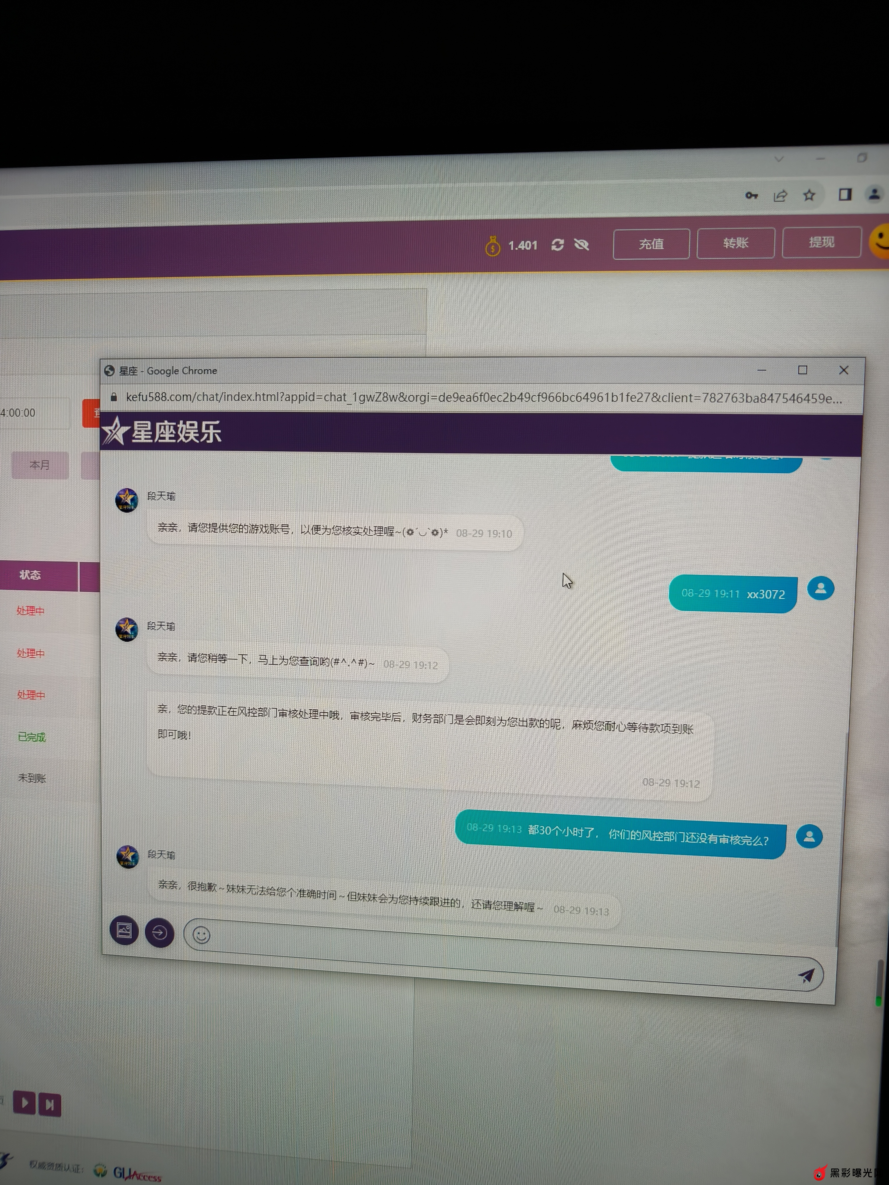 星座娱乐,本金一万二盈利三万二,提款从2023.8.28中午14:14分提款未到账,等了三天客服都是自动回复,一直回复风控部门在审核请耐心等待,上级代理商也只有一句话让我等,直到2023年8.30 晚上我发现我的账户已经被注销,我才发现已经被黑了,没有任何人通知我,我的上级只说了一句话你的号被冻结已处理完成,现在号也上不去,我的上级也不管事,蠢蠢的被黑四万多,此贴曝光出来,大家以后少踩坑。