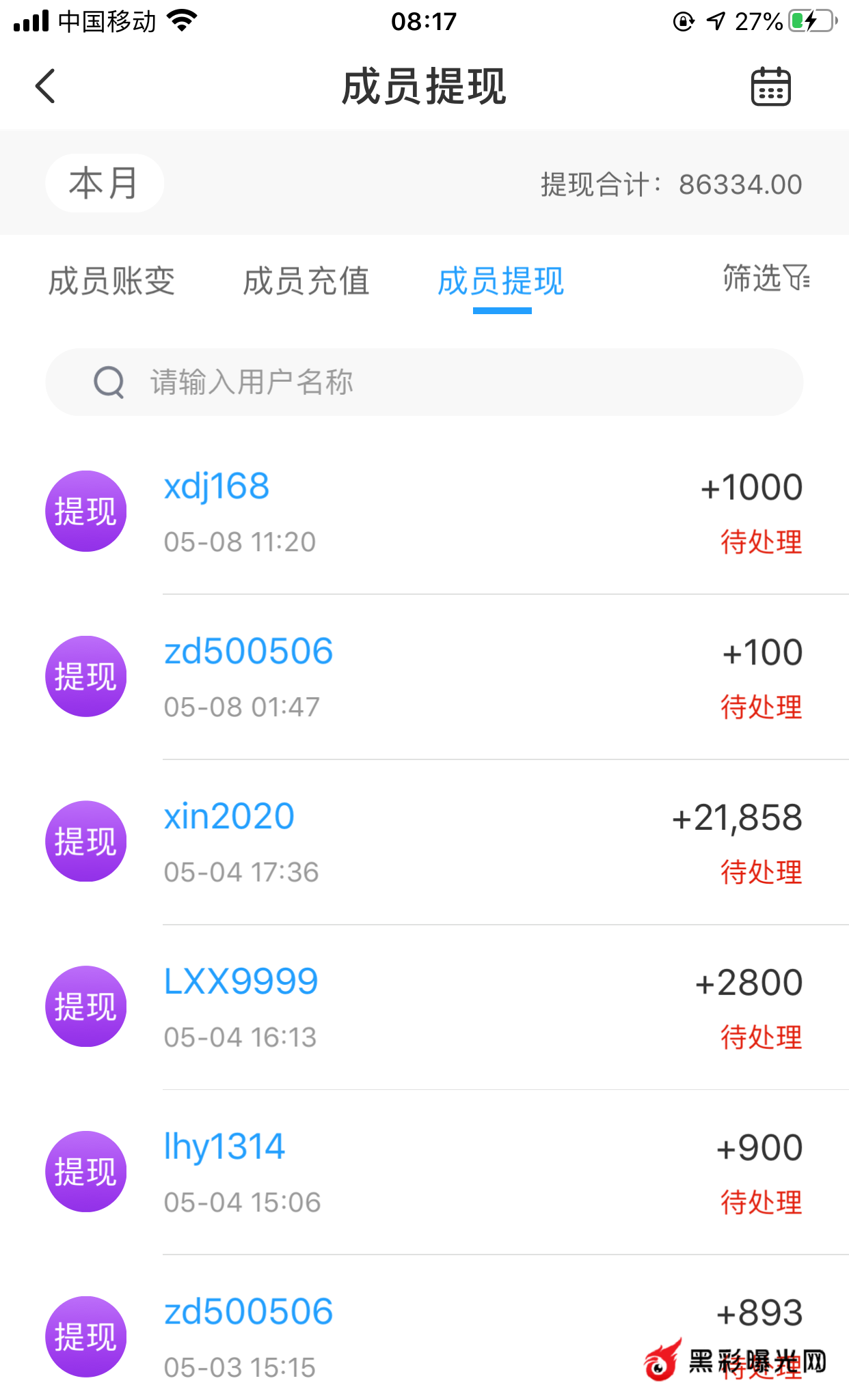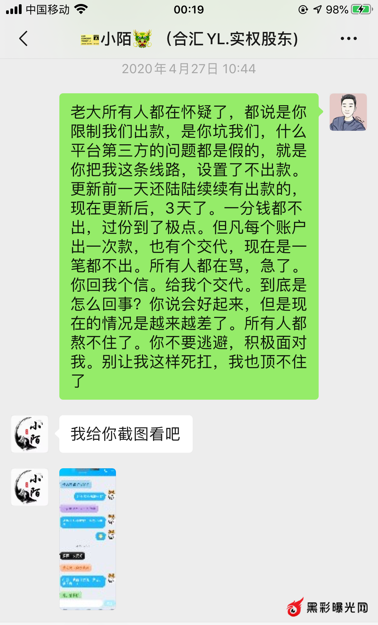 经过:团队从四月下半旬全部卡款,大小额均不出款,也不退回会员账号,一直卡着,联系上级,上级以老婆住院为由,一直拖,到目前为止已经十几天不回复了。