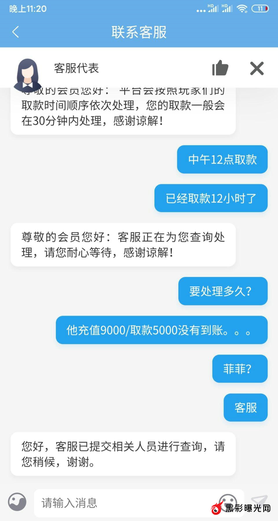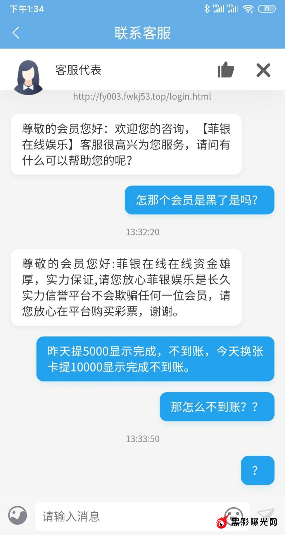 一直等到25号会员换张银行账号继续提款10000,同样如此显示完成,资金不到账,问客服同样昨天如出一辙回复,后被暂停服务。