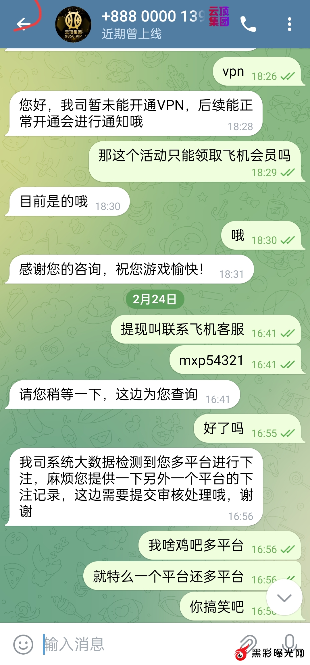 联系上飞机客服,说我刷水居然叫我提供另一个平台的下注记录,我当时就懵逼了。没有工资,就他这个赔率还有必要刷水,充值一两千打了几万流水。还特么刷水,现在抽水严重的时代就单单云顶一万都抽一百,估计二傻子都不刷吧。当天还把我稳住。晚上就移除群组,现在已搜索不到。