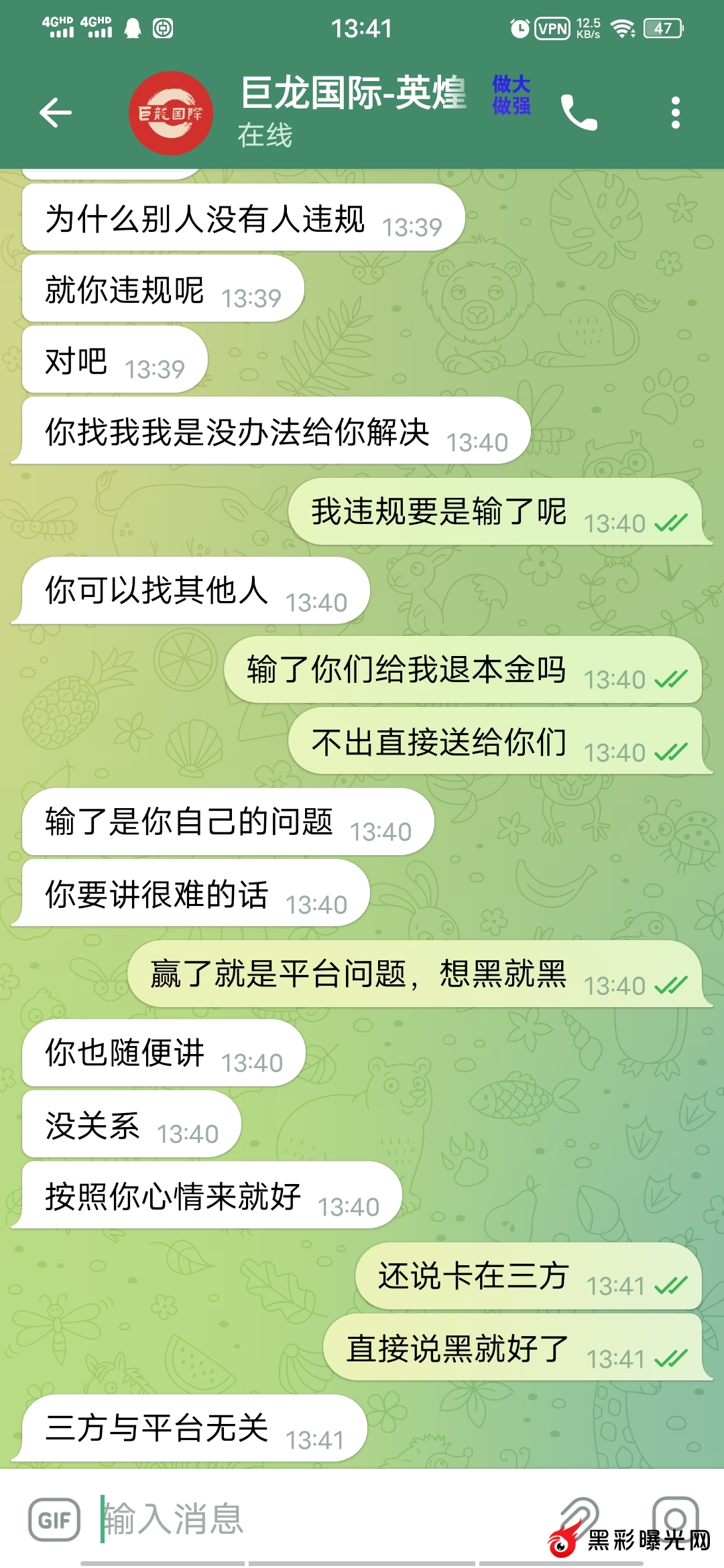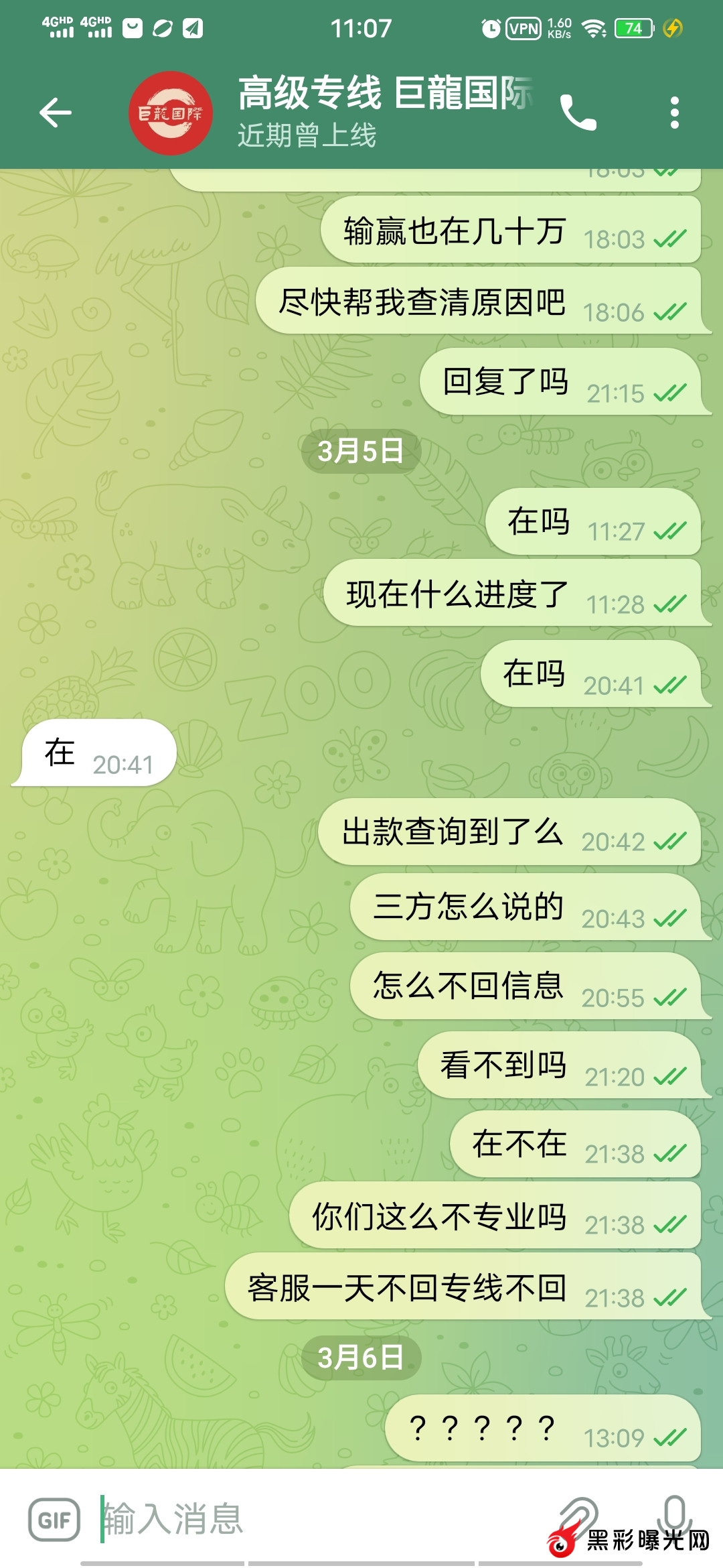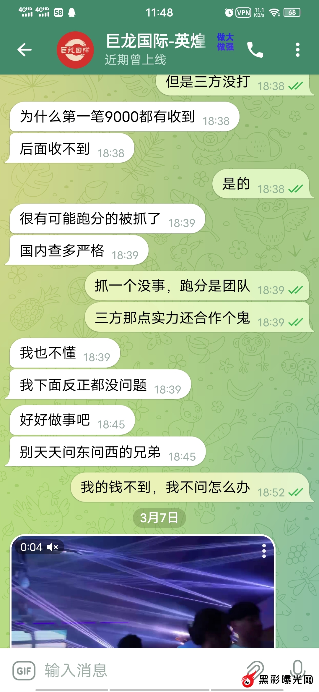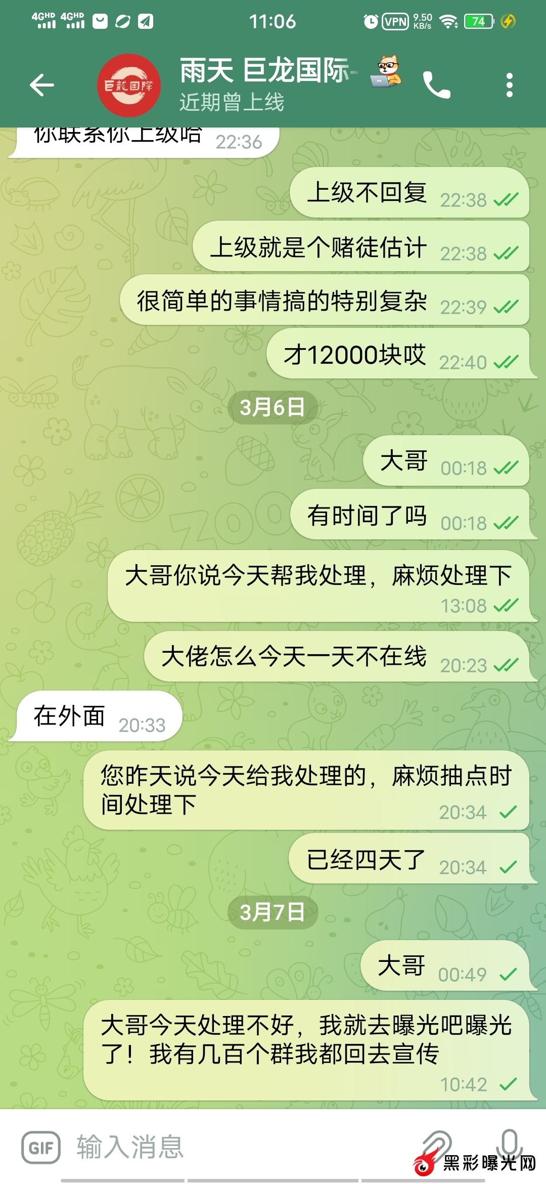 巨龙国际平台3月1日正式开业网站www.julong18.com,3月3日本人充值7000提款12000,平台显示出款!但是实际未到账。当时和平台负责人沟通,让我再充值10000输了就才可以提款!当时意识被黑。后经过寻找多名平台负责人,甚至老板。都是爱答不理,平台主管理由三方卡款,让我等1-7个工作日!接着在今天3月7日追问回复,卡商被抓,三方负责人跑路等理由拒绝处理,一拖再拖!巨龙国际黑平台,圈钱平台大家看到后没玩的不要再去,在玩的赶紧提款走人!要不然下一个被黑的就是你!只要你赢利了都会用各种理由黑款!下面是截图证据希望大家广而告之,别让再多的人上当受骗!骗子飞机号@julongzhuguan @yutian188 @yuntian0在巨龙国际玩的同仁们赶紧撤了