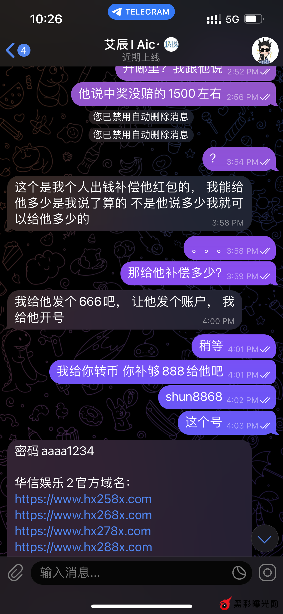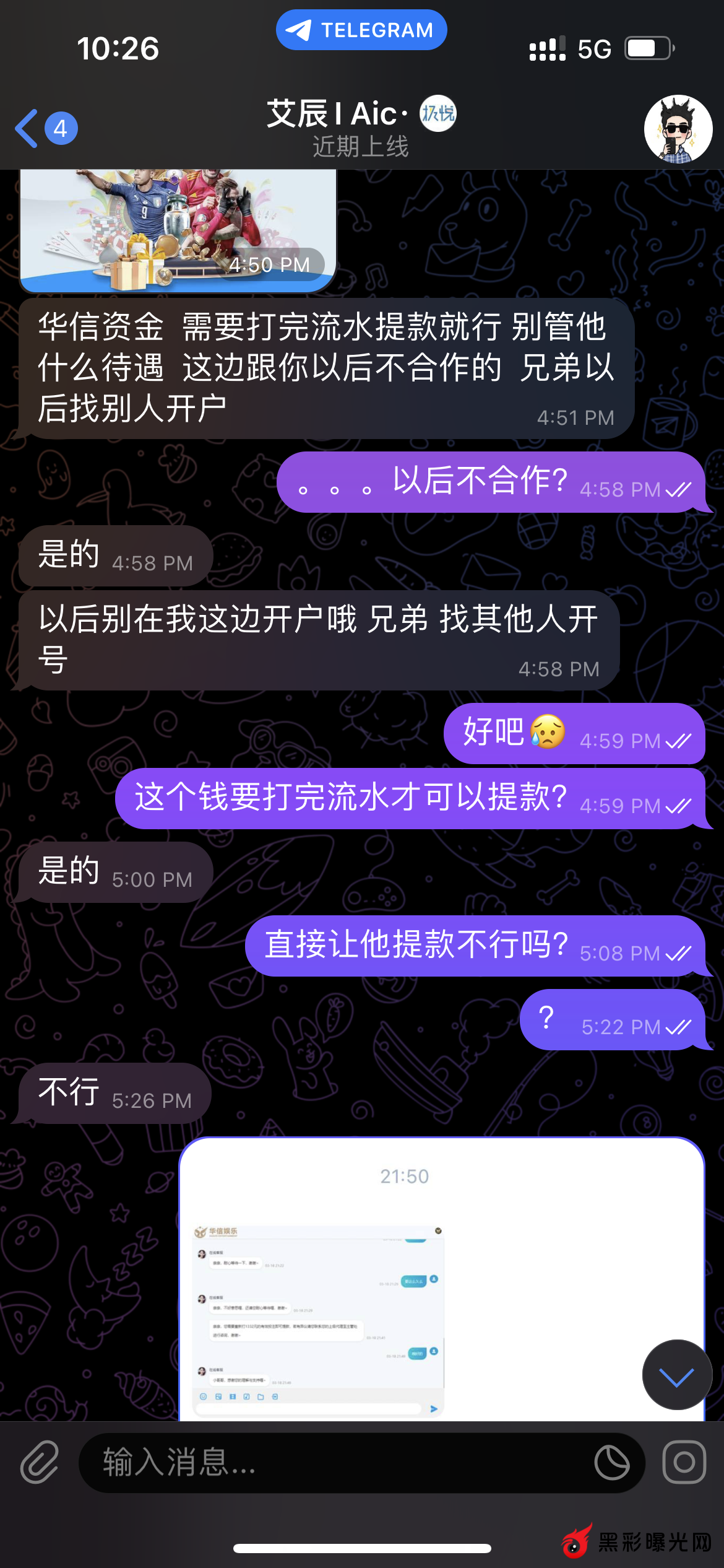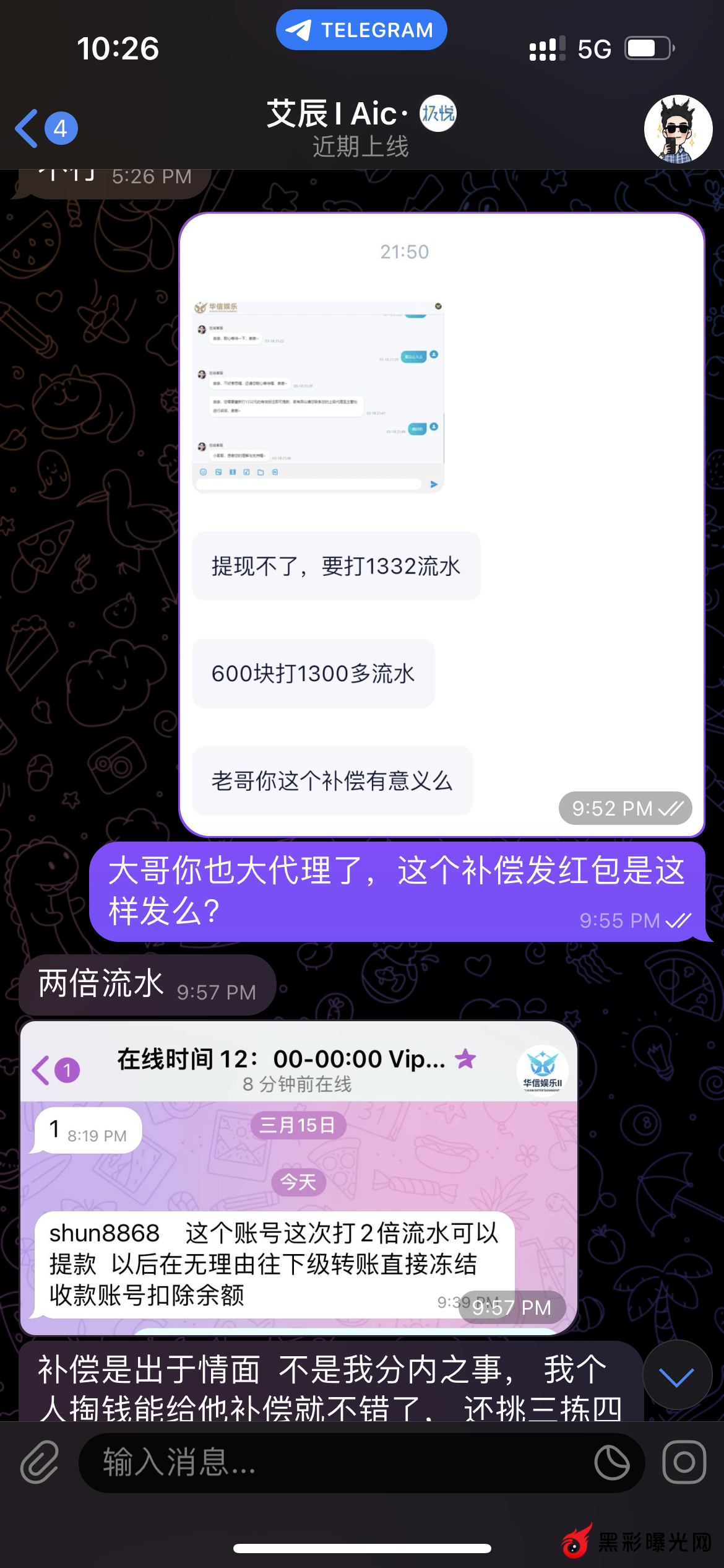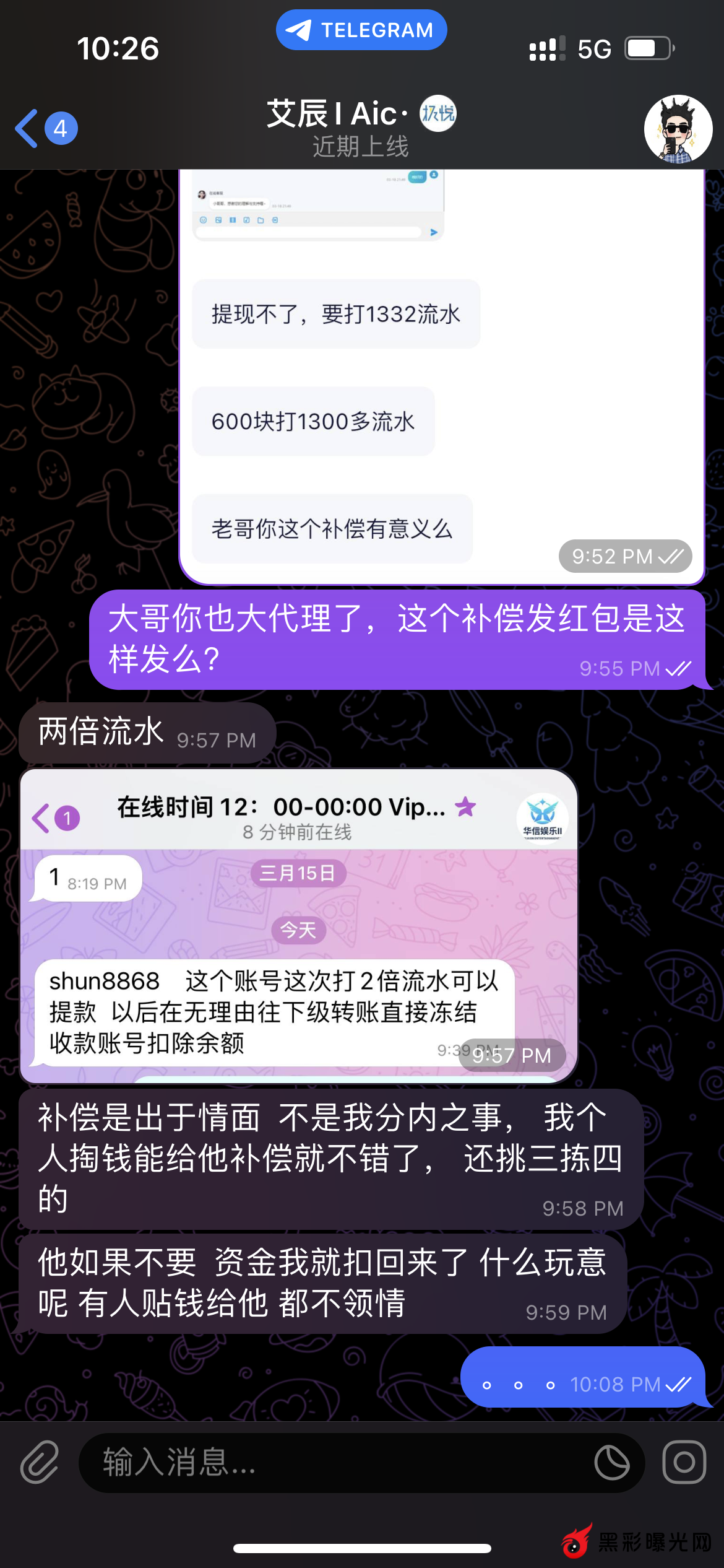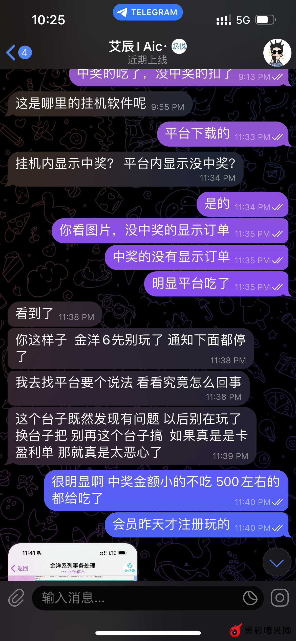 在代理【艾辰Aic】下面合作群开户个几个平台,其中一个金阳6,会员中奖的单给吃了(大约吃了1500中奖的没订单显示,不中奖的订单钱扣了特别恶心下面有图),当时立马找到上级【艾辰Aic】反馈情况,然后上级【艾辰Aic】了解情况之后跟客服协调无果也赞同是平台黑了叫别去玩了,因为是【艾辰Aic】下面注册开户~会员因为这个情况倒输700多,本来是赢1500左右的。当时我就问【艾辰Aic】下面会员这个情况怎么处理,然后【艾辰Aic】画风嘴脸就开始变了。说这边以后不用合作,个人补偿666元红包给会员,让会员发个账号开个户转钱给他,然后去到这个平台会员提现发现要打满2倍流水才能给会员提现,我去问【艾辰Aic】补偿是这样补偿的吗?下面大家看图吧,代理是这样做的吗?这嘴面这代理有人跟敢跟你合作吗?你赚钱就好了,平台安全不安全与你无关的。奉劝大家在他下面真的特别小心了。这次钱不多我自己吐给会员,你比平台吃单子更恶心,艾辰~