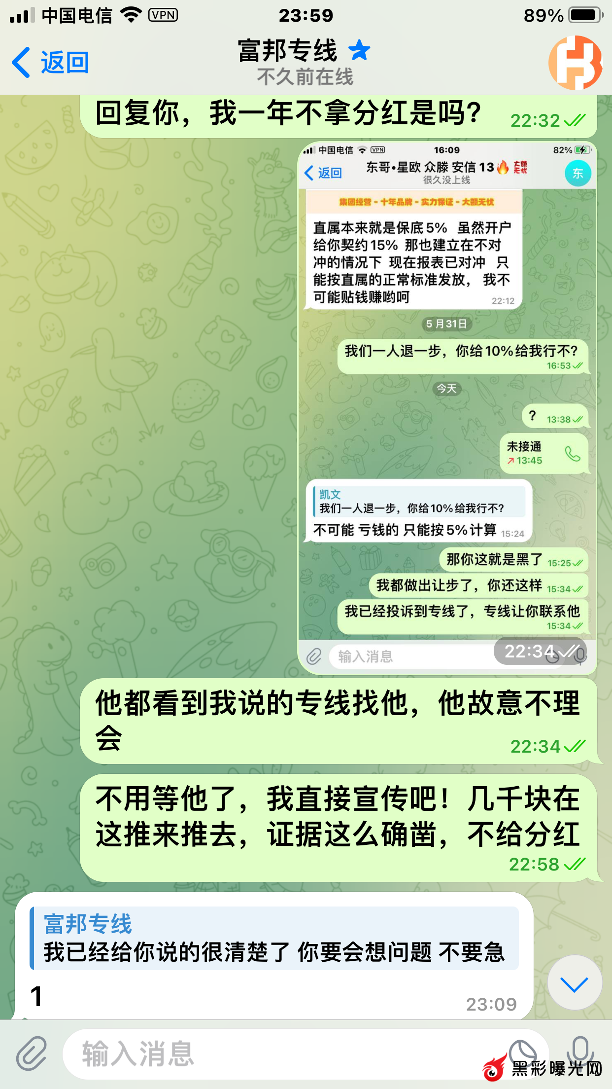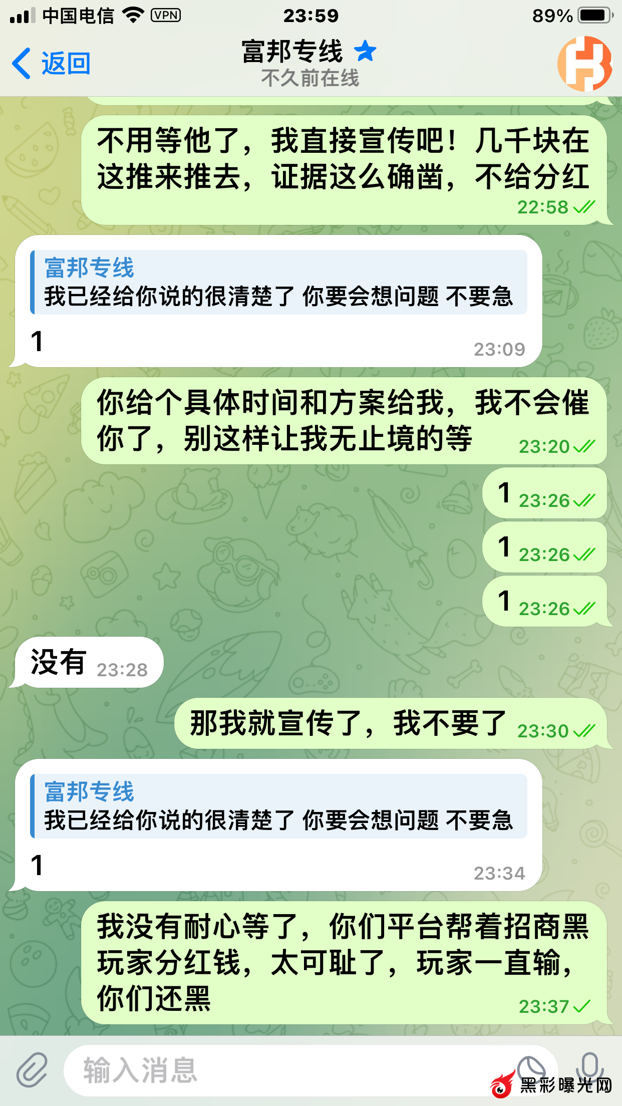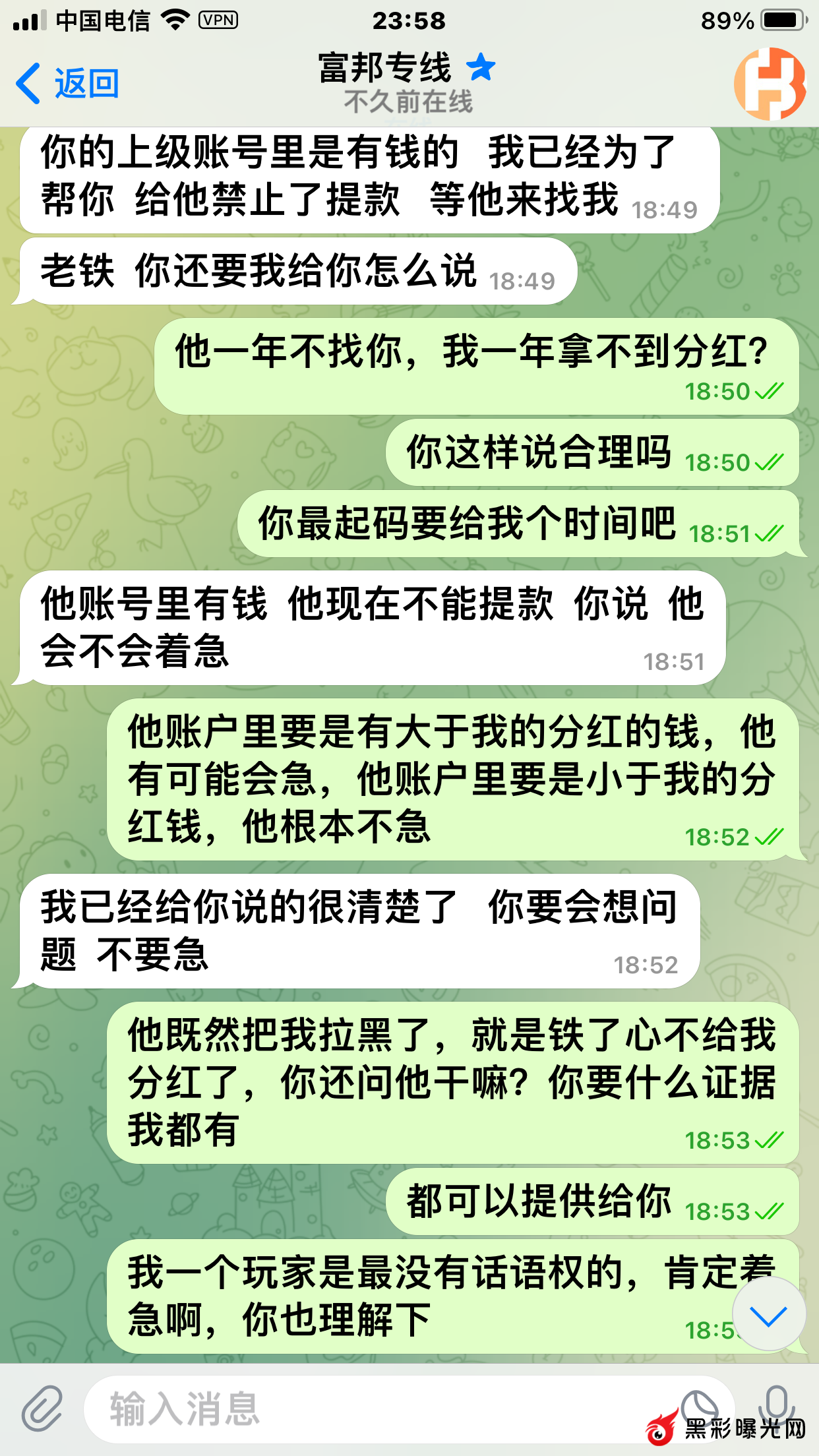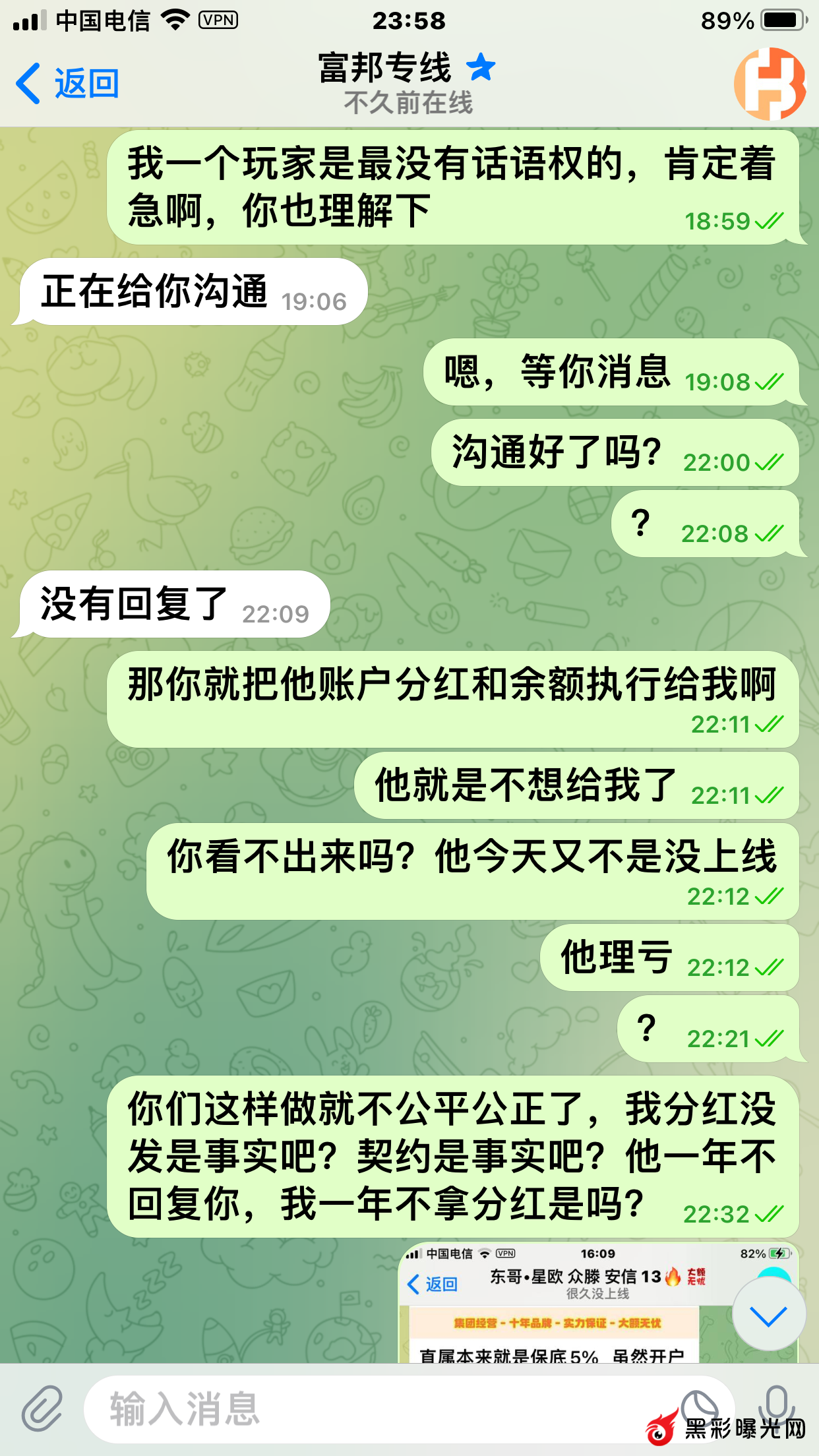 新宝系列的分红契约是摆设,签订了没用,分红日平台会联合招商一起黑玩家分红,在契约事实面前,平台和招商互相踢皮球,我是在富邦娱乐被黑的,接下来新宝会开先锋娱乐,大家远离!!!上级东哥,分红日直接把我拉黑了,他在市场还有两个身份,分别叫楚王和何文耀,我们玩家天天输钱,还要黑分红,欺人太甚!