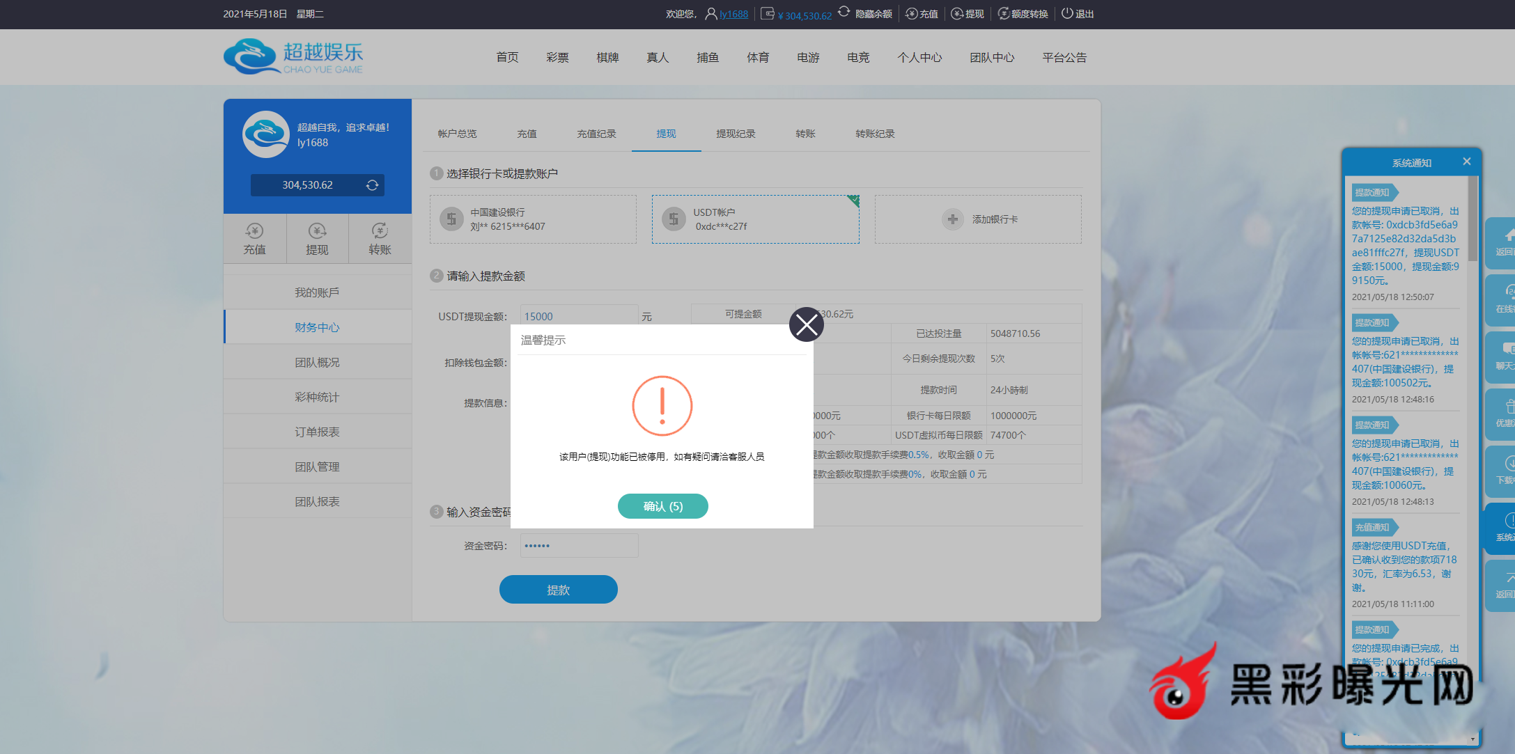 经过:本人超越账号ly1688在超越娱乐拿的待遇是1956+190,5月18号前一天输了10万,后通宵盈利45万拒绝出款30万,