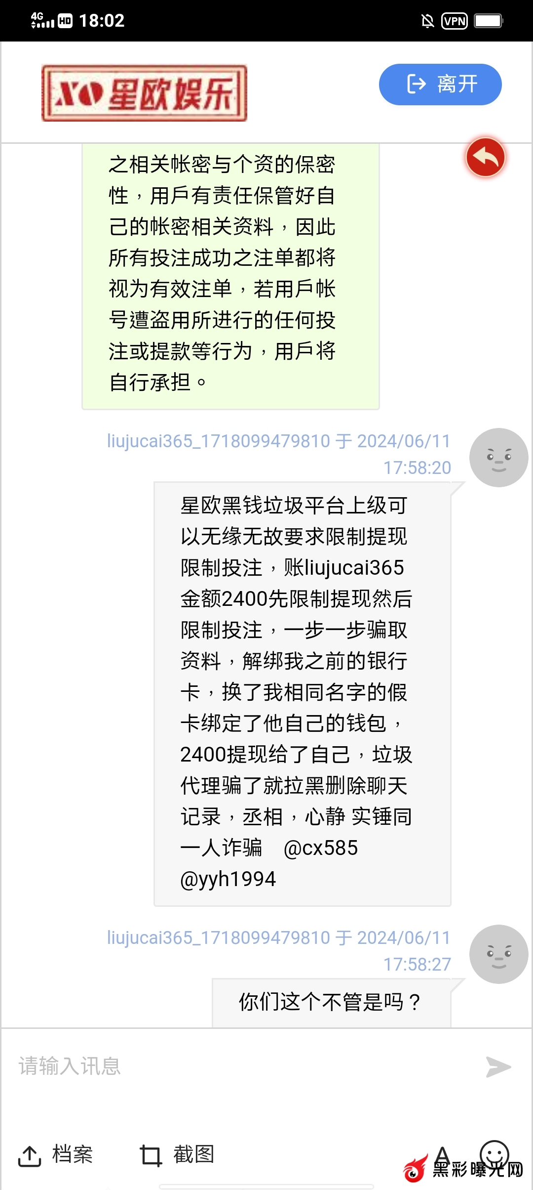 星欧黑钱垃圾平台上级可以无缘无故要求限制提现限制投注,账liujucai365 金额2400先限制提现然后限制投注,一步一步骗取资料,解绑我之前的银行卡,换了我相同名字的假卡绑定了他自己的钱包,2400提现给了自己,垃圾代理骗了就拉黑删除聊天记录,丞相,心静 实锤同一人诈骗 @cx585 @yyh1994(奉劝大家不要去星欧玩,上级可以无缘无故限制提现以及下注)如果不给他们资料就一直限制了,如果给了他们资料就改了资料提现到他们账户了,星欧招商权限太高了,太容易被黑了
