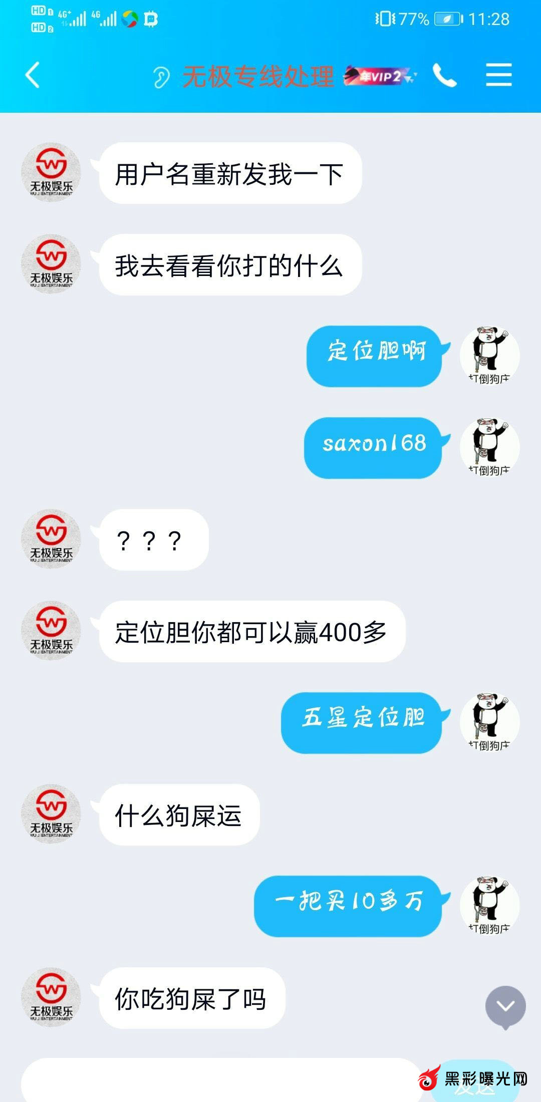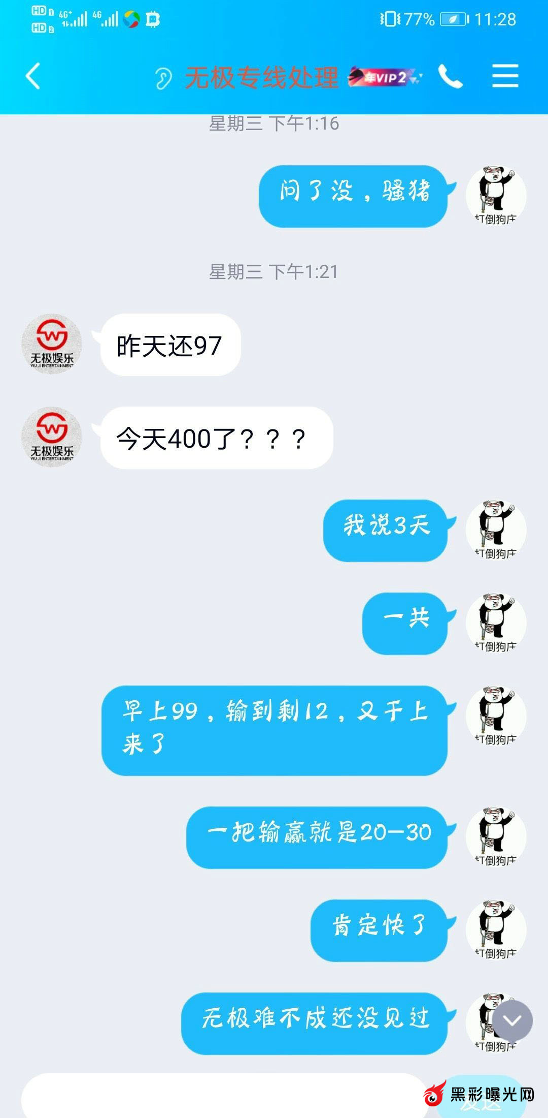 结果我按他们要求提供了以后,又说我是内部人,现在就是,平台客服咬定钱被第三方卡了,时宇也就是招商又说我的钱平台还在风控,然后我去别群曝光,其他无极的人去问就是说我是内部人,之前的给出了已经很不错后面不给。