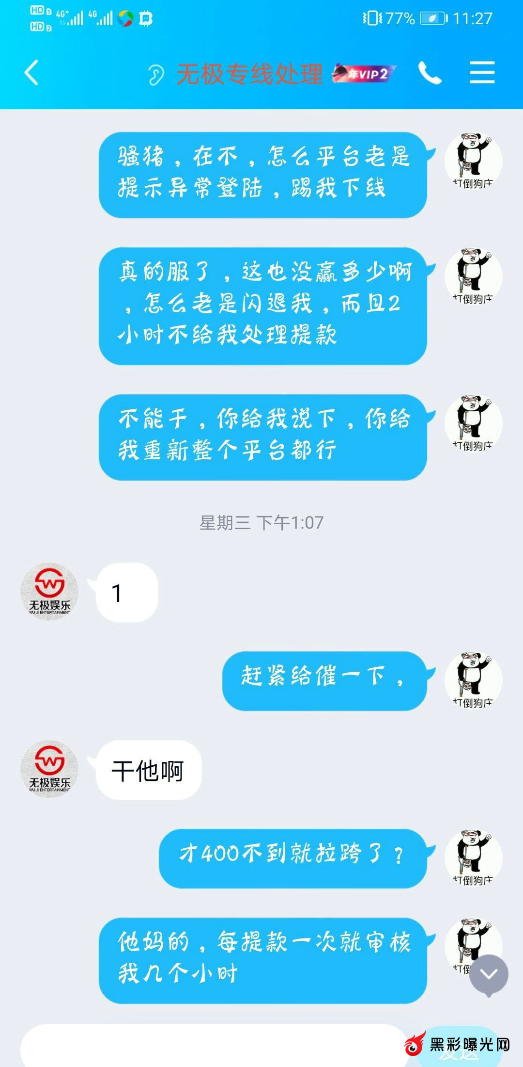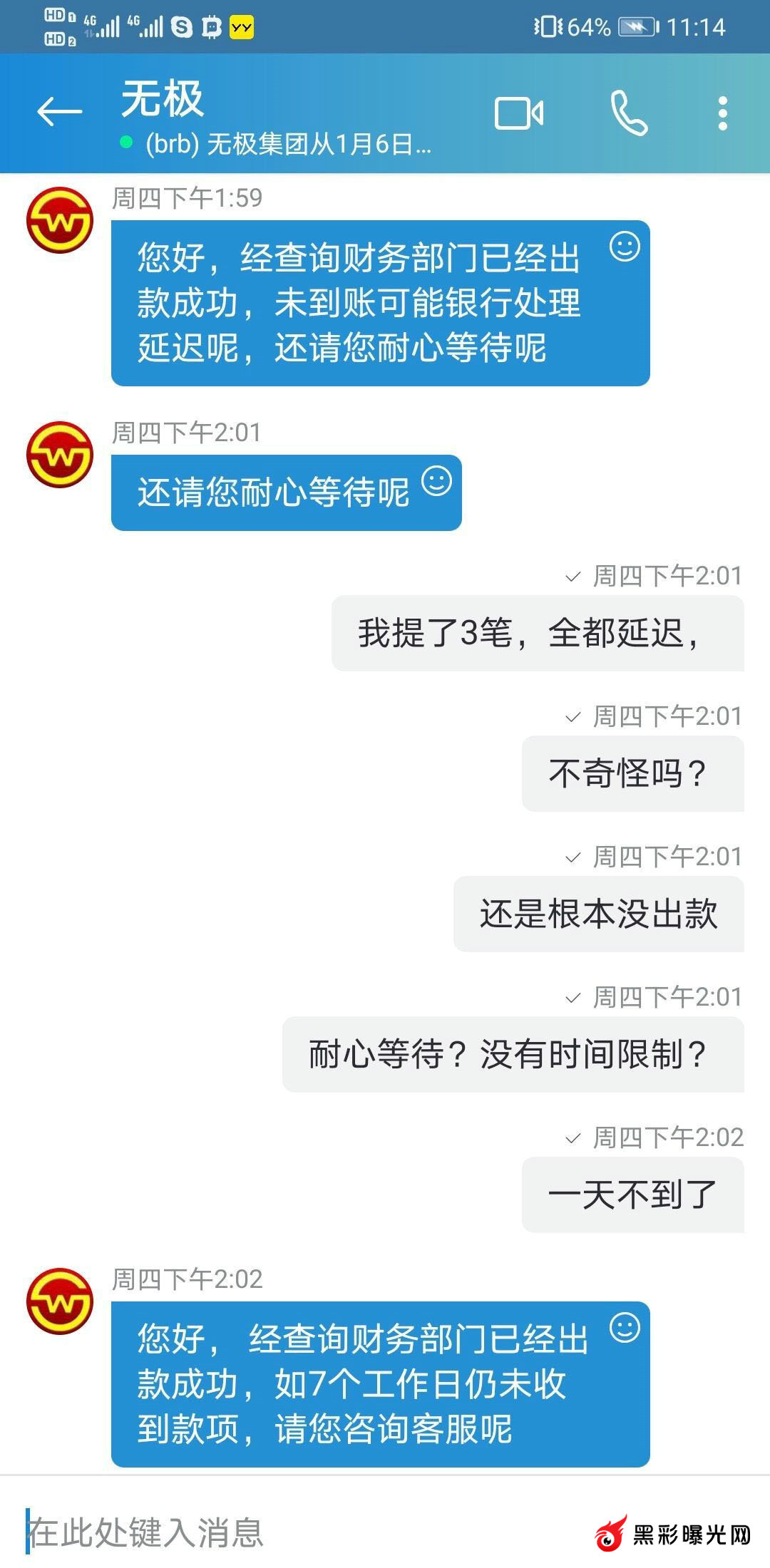 经过:以前在天富输了200w,其后去无极,因为玩的大,一共盈利了差不多400余w,本来前面200w还正常提款,在18号还在正常投注,但是到了18号下午提的20w迟迟没有到账,