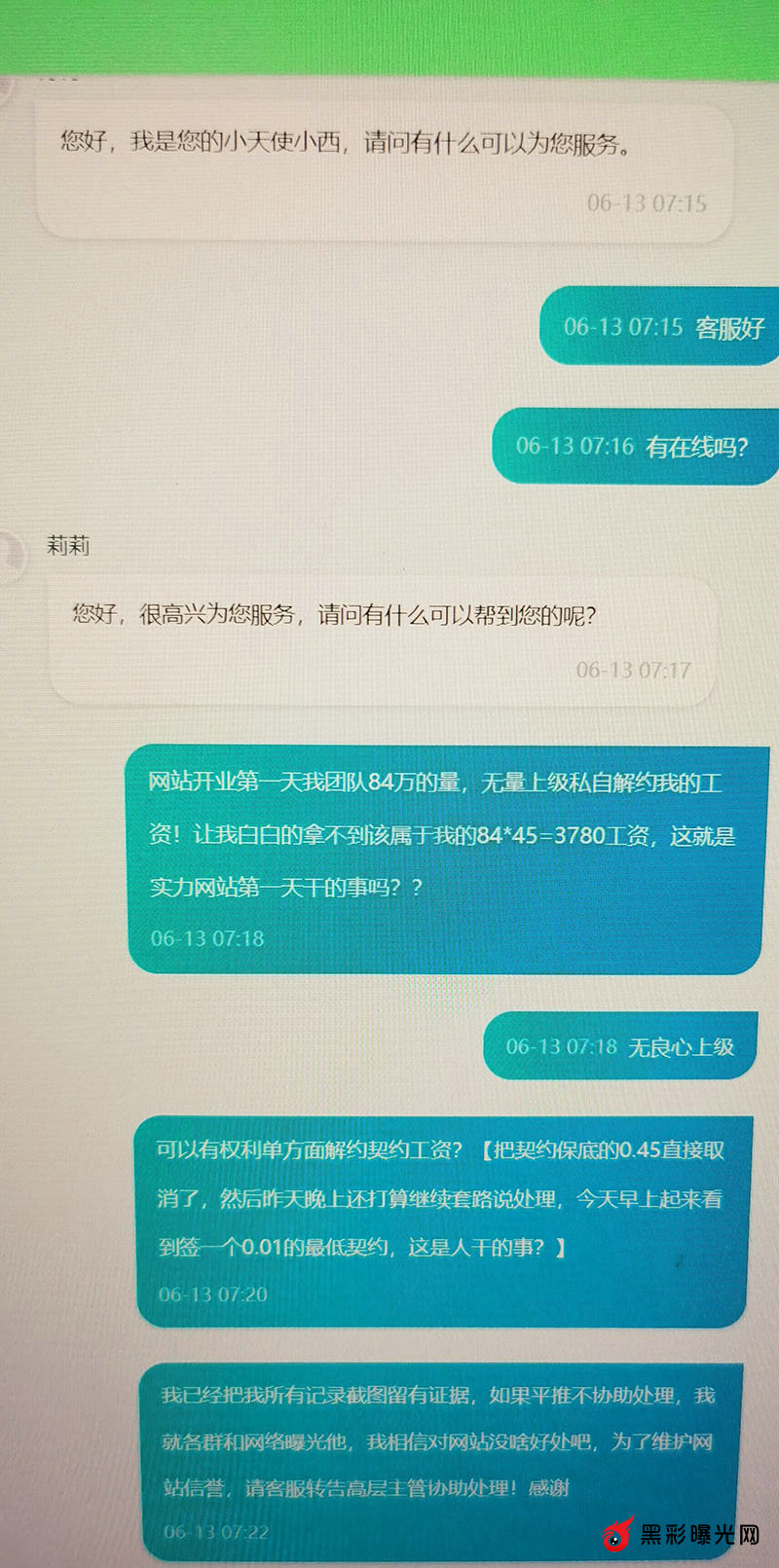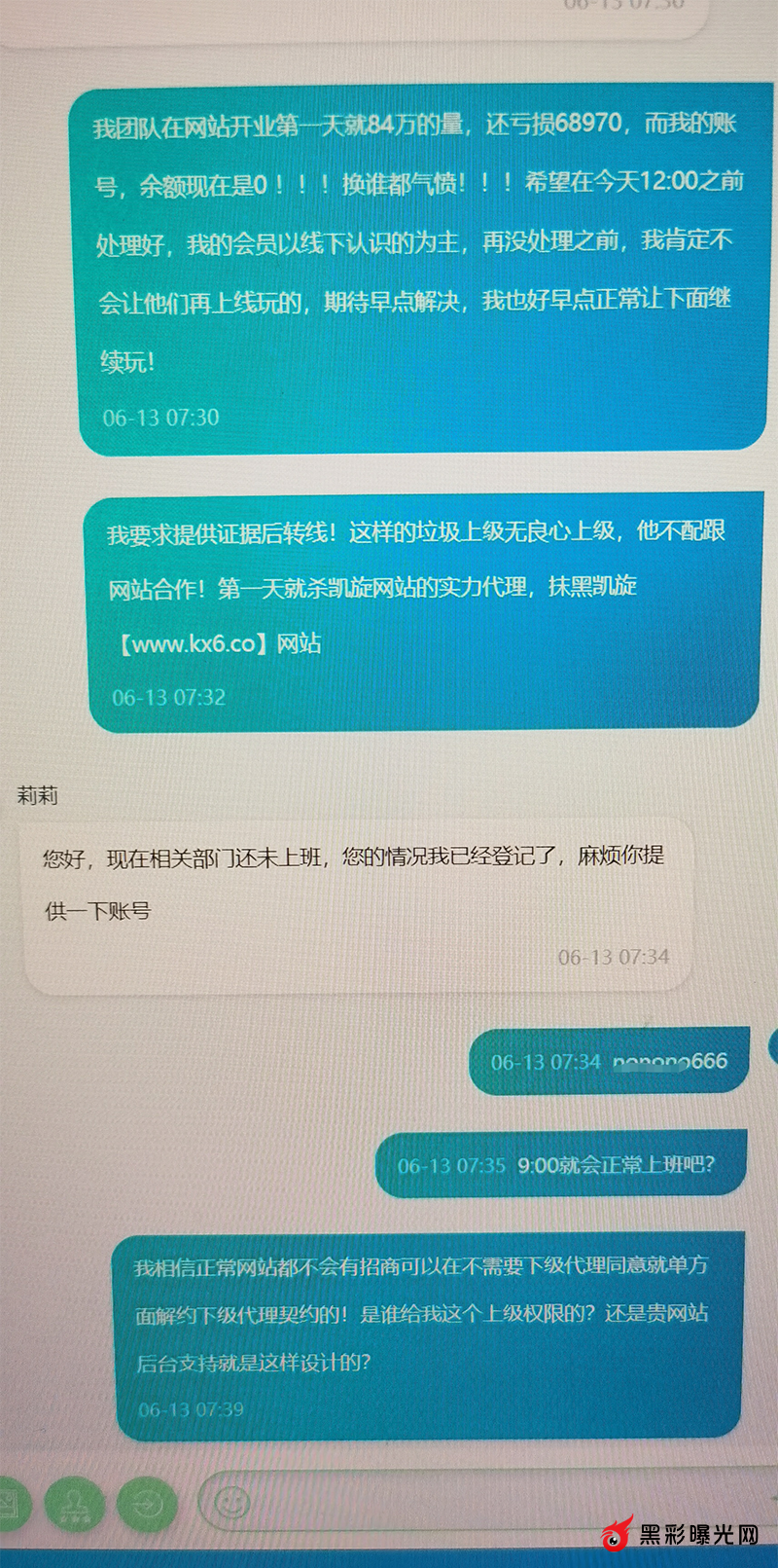 经过:6.12才开业的凯旋网支持招商单方面解约契约,无良黑代“布道者”Q2363778888(小号“韦子”Q706645571)在凯旋开业第一天就黑下级代理84万量日工资和答应的私返