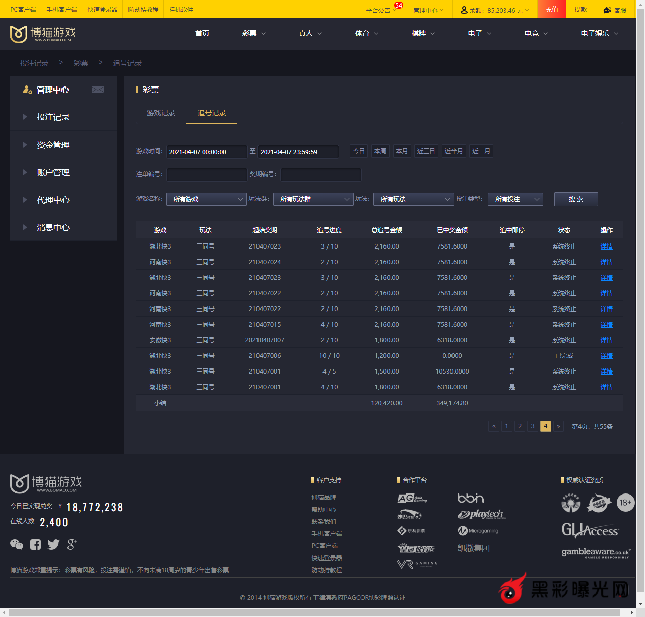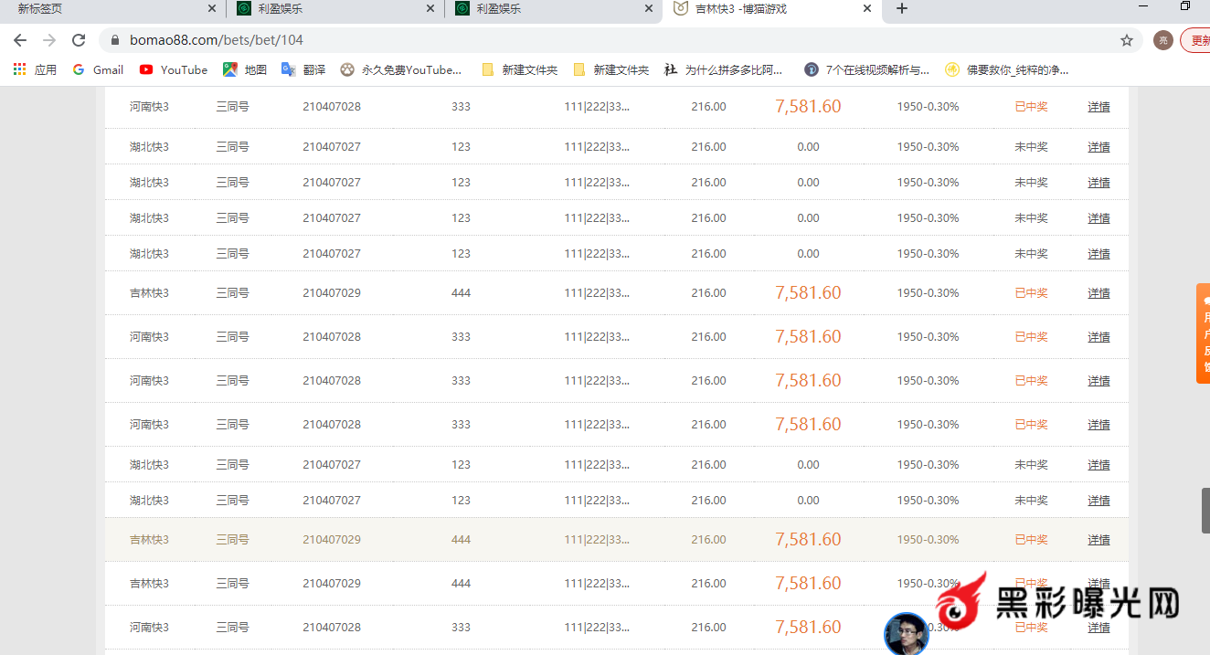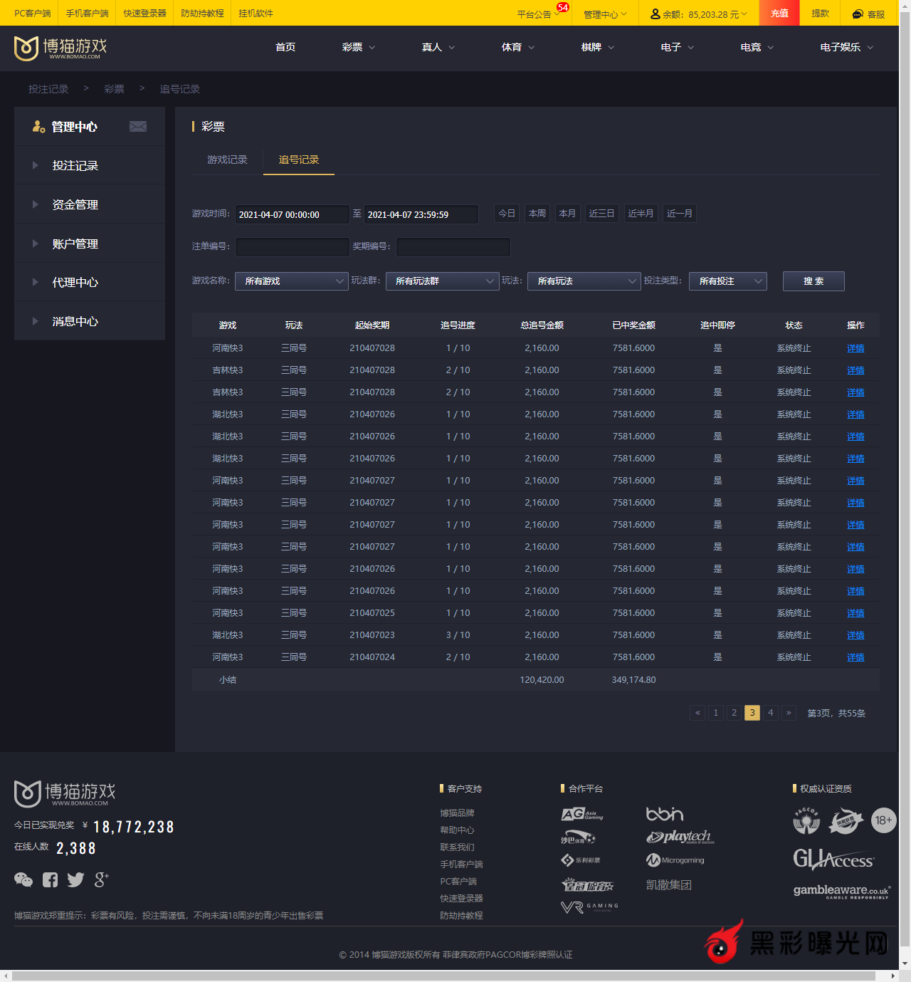 需要跟大家说明的是:我的玩法本人一直玩快三。喜欢全包三同号。3月份就开始玩博猫平台的快三,也就是凤凰联盟开奖的快三。江苏快三、湖北快三、河南快三、吉林快三、安徽快三当然这些都是平台彩。大家都知道的。中奖的前一直在追三同。4月7号倍数增加很幸运追到了河南快三开的三同号、安徽快三开的的三同号、湖北快三开的三同号、吉林快三的三同号。彩金一直在增加达到了44万。上午的时候提了2次共6.8万。下午在提就开始审核不出钱了。