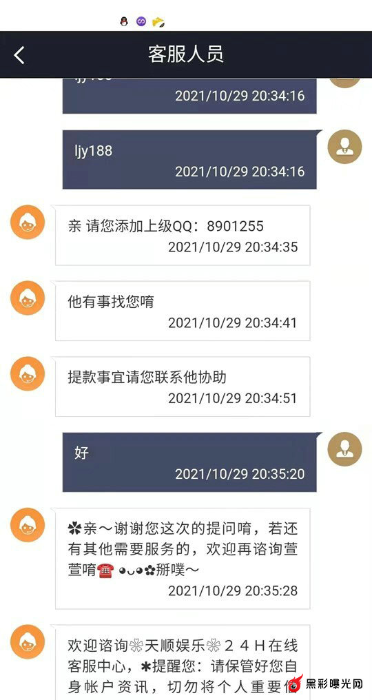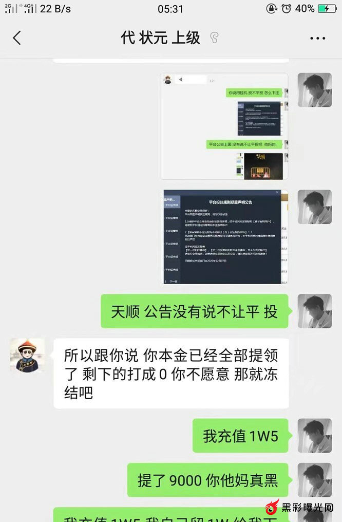 经过:当事人bt2020 用挂机 挂机软件充了1W进去挂了半个小时大概赚了4000多 号上有1W3提了9000留了,5000里面继续挂机打上8000在提3000,一提就是3个小时没有到问客服 客服一直叫我联系上叫,我联系上及他一直不回复话,后面上及主动联系了我,说平台那边不让玩家平投 要求我必须把我号上5000想办法把他输了 不然要封我号 我说不行 我又不是对刷凭又让我把赢的要让我把他输掉,如果是刷子那个刷子1把平投400块 ,我投注700+又没有违规,天顺平台公告上并没有写不让玩家平投 只写投800+以上是违规 我号被平台封了大概半个小时 我下面的 人提款4000+也不让提,后来玩家问客服说提不了款,天顺客服给下级发了他们自己的QQ说 你上级给你留了QQ你去加他 他能协助你出款,我下面的人加了平台客服后 客服把我的团队报表发给我下级说我平时带他们只是为了打量赚他们的工资,然后给我下面的人开号叫过去他那个号玩他那边开的高还有私反工资,我下级把平台说的话全部告诉了我,我觉得平台目的不是为了黑我8000 应该是找理由把我号冻结然后挖我下面的人,我在天顺下面全部开1940-1966无工资可能平台眼红我反点太多然后对我下手,天顺 天系列这样搞我,让我想起以前2016年牛彩 BA平台也是这个操作我以前认识的一个朋友在BA做的好好的突然被封号下面的人全部被挖空然后过了半年平台直接转直营,天顺用这个下贱的手段跟当你BA很相似,我就赢了8000都黑的平台 如果不是要关门可能就是要转直营了,目前还做天系列或者玩家赶紧转台 不要等到被黑才后悔!下面就是平台客服拉我下级还有我跟上级聊天记录