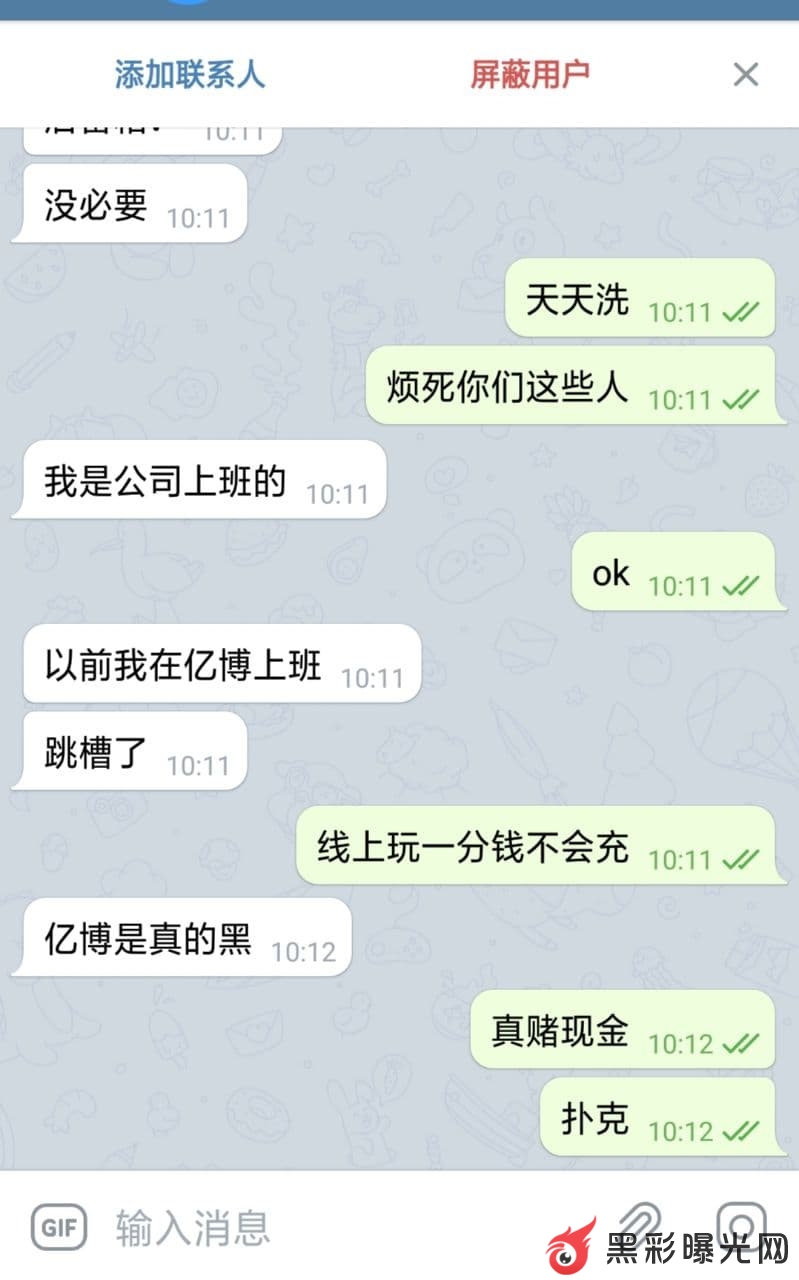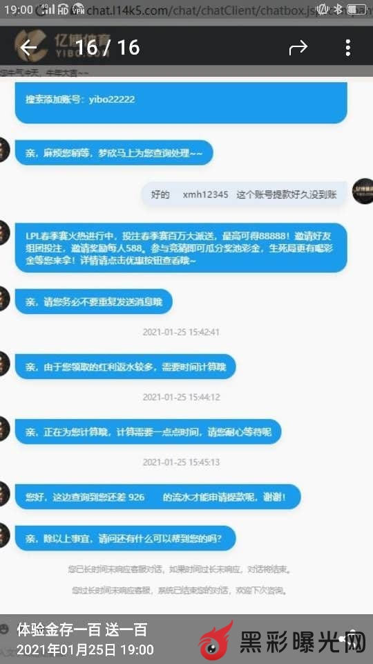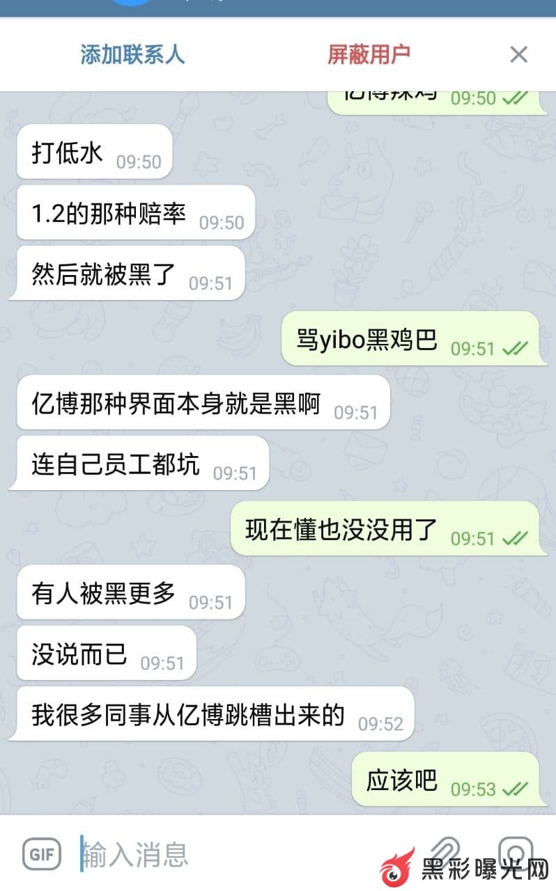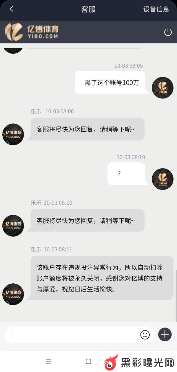本人无意接到电销电话,说亿博体育是大平台,拥有正规牌照的公司,然后被他们电销部门忽悠去玩,一开始充小额能提款,后面玩上头了就充值90万进去,因为之前他们说过本金多,倍投才能赢。从90万打到99.3万,就想提款了,第二天再继续玩,当做投资一样,一天5-10万也是不错的收益,没想到提现就提现不了,后面问客服,客服各种不理。后面账号直接冻结了,当时一脸懵逼,因为没接触过被黑款,不知道怎么办,就各种网上咨询人,他们就说上纸飞机去问问看,后面经多方打听,确定是内部黑款,还说我刷子套利,我连怎么刷都不知道。输不起别开庄,赢了黑,不讲武德,我就是不舒服,至今他们还派人来丑化我,辱骂说我傻逼,说赌博呢讲你妈武德。