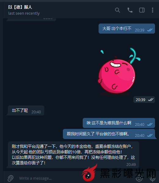 最后松口说,退还本金10W,其余资金冻结账户,等团队亏损金额到余额的10倍一起出款。
