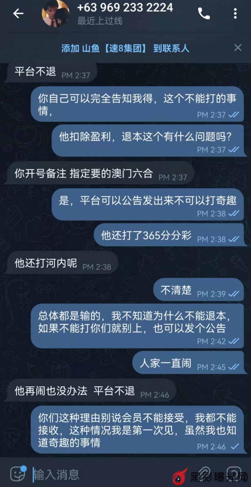 后面跟平台协商出本金,上级山鱼说该平台彩种是上给有需要的人玩,不给出本金,也不给出任何余额、那何为是有需要的人呢,就是那种输钱的人才能去玩, 大家远离黑平台 宇博 这个平台后面还想去做世界杯 就这实力,我冒昧的问一下你们速八集团是不是开宾馆的下面是我跟山鱼这个死ma的聊天记录 大家自己悟。